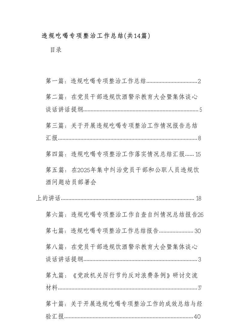 违规吃喝专项整治工作总结(共14篇)目录第一篇:违规吃喝专项整治工作总结…第二篇:在党员干部违规饮酒警示教育大会暨集体谈心谈话讲话提纲.5第三篇:关于开展违规吃喝专项整治工作情况报告总结汇报8第四篇:违规吃喝专项整治工作落实情况总结汇报…15第五篇:在2025年集中纠治党员干部和公职人员违规饮酒问题动员部署会上的讲话…18第六篇:违规吃喝专项整治工作自查自纠情况总结报告26第七篇:违规吃喝专项整治工作总结报告…30第八篇:在党员干部违规饮酒警示教育大会暨集体谈心谈话讲话提纲.3第九篇:《党政机关厉行节约反对浪费条例》研讨交流第十篇:关于开展违规吃喝专项整治工作的成效总结与经第十一篇:在集中纠治党员干部和公职人员违规饮酒问题动员部署会上的.47第十二篇:违规吃喝专项整治工作阶段性进展与成效总第十三篇:违规吃喝专项整治工作监督检查情况总结汇报第十四篇:关于违规吃喝专项整治工作开展情况的总结第一篇:违规吃喝专项整治工作总结为进一步加强党风廉政建设,严肃财经纪律,营造风清气正的政治生态,根据上级部门关于开展违规吃喝问题专项整治工作的统一部署,我单位自☆☆年☆☆月起,全面启动了为期☆☆个月的违规吃喝专项整治行动。现将专项整治工作开展情况总结如下:一、开展情况(一)加强组织领导,明确工作责任。一是为确保专项整治工作有序进行,成立由主要领导任组长,纪检监察、财务审计、人事组织等多部门负责人组成的专项整治工作领导小组,下设办公室负责日常工作协调与推进。二是领导小组多次召开专题会议,研究制定《违规吃喝专项整治工作实施方案》,明确整治目标、重点任务、责任分工及时间节点,