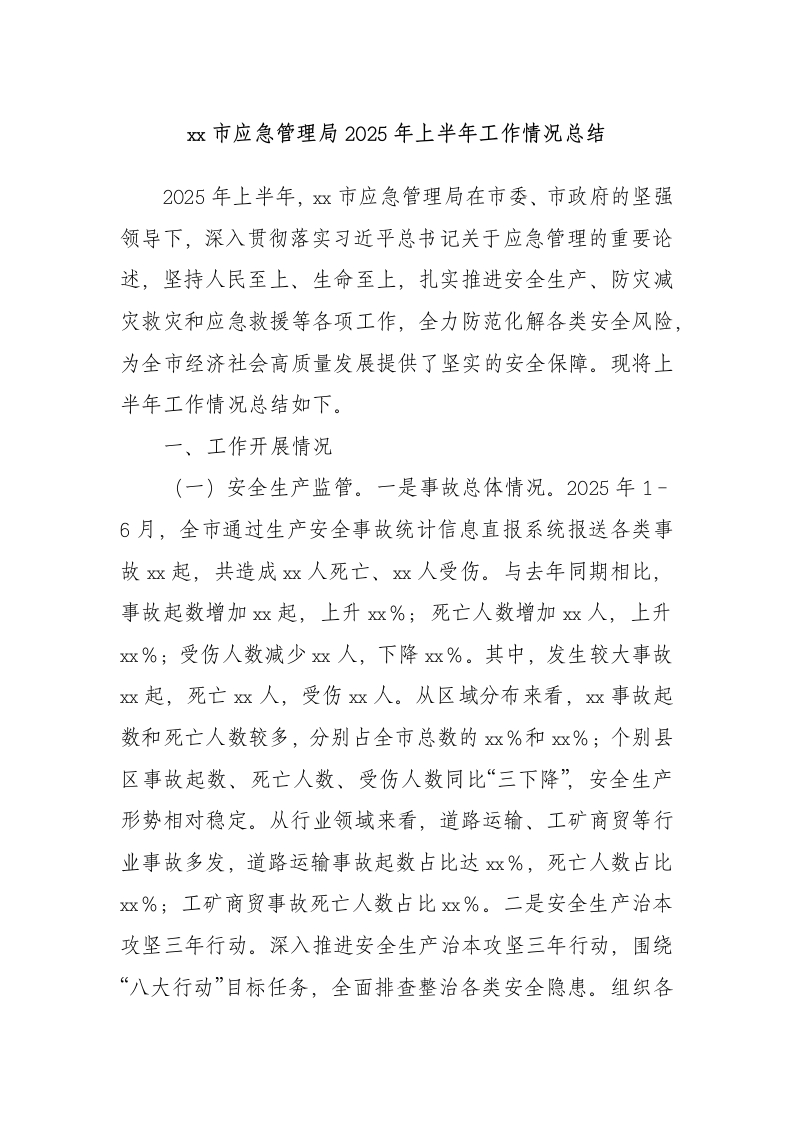 xx市应急管理局2025年上半年工作情况总结2025年上半年,x市应急管理局在市委、市政府的坚强领导下,深入贯彻落实习近平总书记关于应急管理的重要论述,坚持人民至上、生命至上,扎实推进安全生产、防灾减灾救灾和应急救援等各项工作,全力防范化解各类安全风险,为全市经济社会高质量发展提供了坚实的安全保障。现将上半年工作情况总结如下。一、工作开展情况(一)安全生产监管。一是事故总体情况。2025年1-6月,全市通过生产安全事故统计信息直报系统报送各类事故x起,共造成x人死亡、x人受伤。与去年同期相比,xx%受伤人数减少x人,下降双%。其中,发生较大事故数和死亡人数较多,分别占全市总数的x%和x%;个别县区事故起数、死亡人数、受伤人数同比“三下降”,安全生产形势相对稳定。从行业领域来看,道路运输、工矿商贸等行业事故多发,道路运输事故起数占比达双%,死亡人数占比巡%;工矿商贸事故死亡人数占比燃%。二是安全生产治本攻坚三年行动。深入推进安全生产治本攻坚三年行动,围绕“八大行动”目标任务,全面排查整治各类安全隐患。组织各行业主管部门对危险化学品、烟花爆竹、矿山、工贸、城镇燃气、建筑施工、道路交通、水上交通、文化旅游、消防等重点行业领域开展专项整治。截至6月底,共检查企业燃家次,发现问题隐患双项,已完成整改双项,整改率x%;下达责令整改指令书双份,行政处罚双次,罚款燃万元。通过专项整治,有效消除了一批重大安全隐患。三是综合监督检查计划执行。严格按照《xx市应急管理局2025年度应急管理综合监督检查计划》开展工作,坚持分类分级和“双随机、一公开”监管原则。上半年,对重点生产经营单位监督检查覆盖率达到%,重点执法事项检查覆盖率x%,监督检查计划完成率x%。运用“互联网+执法”系统,实现执法全过程信息化记录,系统应用率达燃%。对检查中发现的重大事故隐患,建立台账,跟踪督办,重大事故隐患整改率达到x%;对一般事故隐患,按期复查,复查率x%。四是安全生产举报处理。加强安全生产举报工作,畅通举报渠道,鼓励群众参与安全生产监督。1-6月,全市共受理生产安全事故、安全生产隐患和非法违法行为等三类举报双件,同比下降燃%,查实双件,查实率%;发放举报奖励燃元。其中,应急管理部门受理举报燃件,查实x件,发放举报奖励燃元。对举报件严格按照规定时限办理,规范举报答复,确保举报人满意。对举报受理数量较低的县区,督促加大宣传力度,提高群众参与度。(二)防灾减灾救灾。一是自然