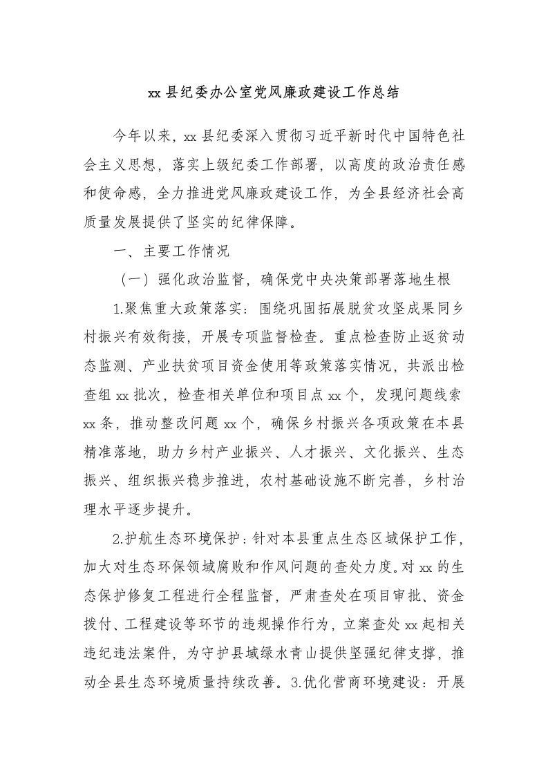 双县纪委办公室党风廉政建设工作总结今年以来,双县纪委深入贯彻习近平新时代中国特色社会主义思想,落实上级纪委工作部署,以高度的政治责任感和使命感,全力推进党风廉政建设工作,为全县经济社会高质量发展提供了坚实的纪律保障。一、主要工作情况(一)强化政治监督,确保党中央决策部署落地生根1.聚焦重大政策落实:围绕巩固拓展脱贫攻坚成果同乡村振兴有效衔接,开展专项监督检查。重点检查防止返贫动态监测、产业扶贫项目资金使用等政策落实情况,共派出检查组x双批次,检查相关单位和项目点双个,发现问题线索精准落地,助力乡村产业振兴、人才振兴、文化振兴、生态振兴、组织振兴稳步推进,农村基础设施不断完善,乡村治理水平逐步提升。2.护航生态环境保护:针对本县重点生态区域保护工作,加大对生态环保领域腐败和作风问题的查处力度。对燃的生态保护修复工程进行全程监督,严肃查处在项目审批、资金拨付、工程建设等环节的违规操作行为,立案查处巡起相关违纪违法案件,为守护县域绿水青山提供坚强纪律支撑,推动全县生态环境质量持续改善。3.优化营商环境建设:开展优化营商环境专项监督行动,围绕行政审批、政务服务、市场监管等方面,深入企业走访调研x燃次,收集企业反映的难点堵点问题双个。对涉企部门开展明察暗访燃次,查处吃拿卡要、懒政怠政、权力寻租等问题双起,处理相关人员x人,推动构建亲清新型政商关系,激发市场主体活力,助力全县营商环境不断优化,吸引更多企业来本地投资兴业。(二)持续正风肃纪,营造风清气正政治生态1.严查“四风”问题:持续开展违反中央八项规定精神问题专项整治,紧盯违规吃喝、违规发放津补贴、公车私用等突出问题。通过明察暗访、大数据筛查等方式,发现并查处“四风”问题线索这条,给予党纪政务处分双人,通报曝光典型案例双起,强化警示震慑效应,推动全县党员干部作风持续好转。2.整治形式主义、官僚主义:聚焦文山会海、过度留痕、检查考核过多过频等形式主义、官僚主义问题,开展集中整治。精简文件会议双%,整合优化考核检查项目项,严肃查处在工作中推诿扯皮、敷衍塞责等问题xx起,处理x人,切实为基层减负松绑,让干部有更多时间和精力抓落实。3.推进以案促改、以案促治:在查办违纪违法案件过程中,注重深入剖析案件背后的制度漏洞和管理薄弱环节,发出监察建议书燃份,督促相关单位完善制度x项,建立廉政风险防控机制双个。例如,在查办双案件后,针对该单