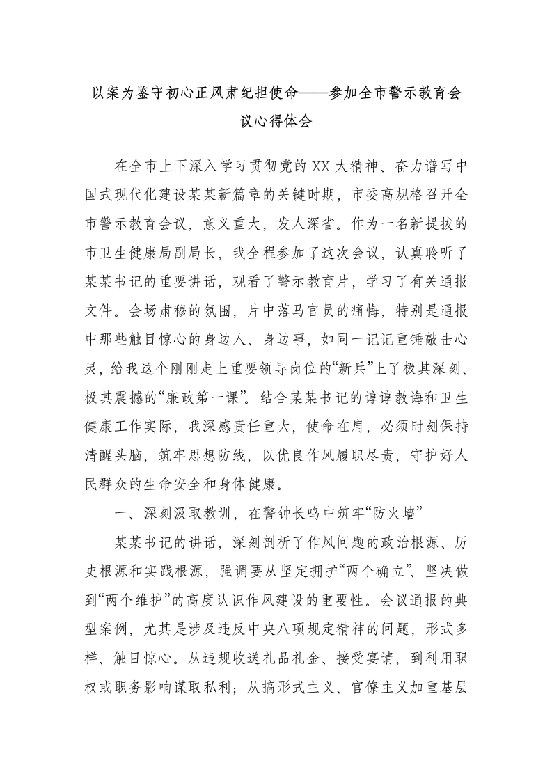 以案为鉴守初心正风肃纪担使命一参加全市警示教育会议心得体会在全市上下深入学习贯彻党的X大精神、奋力谱写中国式现代化建设某某新篇章的关键时期,市委高规格召开全市警示教育会议,意义重大,发人深省。作为一名新提拔的市卫生健康局副局长,我全程参加了这次会议,认真聆听了某某书记的重要讲话,观看了警示教育片,学习了有关通报文件。会场肃穆的氛围,片中落马官员的痛悔,特别是通报中那些触目惊心的身边人、身边事,如同一记记重锤敲击心灵,给我这个刚刚走上重要领导岗位的“新兵”上了极其深刻、极其震撼的“廉政第一课”结合某某书记的谆谆教诲和卫生健康工作实际,我深感责任重大,使命在肩,必须时刻保持清醒头脑,筑牢思想防线,以优良作风履职尽责,守护好人民群众的生命安全和身体健康。一、深刻汲取教训,在警钟长鸣中筑牢“防火墙”某某书记的讲话,深刻剖析了作风问题的政治根源、历史根源和实践根源,强调要从坚定拥护“两个确立”、坚决做到“两个维护”的高度认识作风建设的重要性。会议通报的典型案例,尤其是涉及违反中央八项规定精神的问题,形式多样、触目惊心。从违规收送礼品礼金、接受宴请,到利用职权或职务影响谋取私利;从搞形式主义、官僚主义加重基层负担,到生活奢靡、贪图享乐…这些案例中的主角,有的曾是令人尊重的领导干部,有的身处关键岗位,却因理想信念动摇、宗旨意识淡薄、纪律观念松弛,最终滑向违法犯罪的深渊,不仅断送了个人前程、毁掉了家庭幸福,更严重损害了党的形象、侵蚀了党的执政根基,给党和人民的事业造成了无法挽回的损失。对我而言,这些教训尤为深刻:“新”岗位意味着“新”风险。走上副局长岗位,手中掌握着一定的资源配置权、项目审批权、行业监管权,面临的诱惑和考验将比以往更多、更复杂。一些别有用心之人可能会以各种“糖衣炮弹”进行围猎,稍有不慎,就可能重蹈覆辙。警示片和通报中那些从“小恩小惠”开始,最终陷入“大贪大腐”深渊的案例,就是活生生的反面教材。我必须时刻警惕“第一次”,严防“人情陷阱”,坚决守住底线。卫健领域是廉洁风险“高发区”。卫生健康事业关系千家万户,涉及药品器械采购、工程建设、医保资金使用、行政审批等多个高风险环节,资金密集、资源富集。近年来,医疗卫生领域反腐败斗争持续深入,通报的案例中也不乏卫健系统的身影。这警醒我,在分管工作中,必须紧盯药品耗材招采、基建项目、医保基金监管、人事招聘等关键领域和环节,堵塞制度漏洞,强化风险防控,绝不能让人民的“救命钱”“健康权”成为少数人谋取私利的工具。“四风”问题具有顽固性