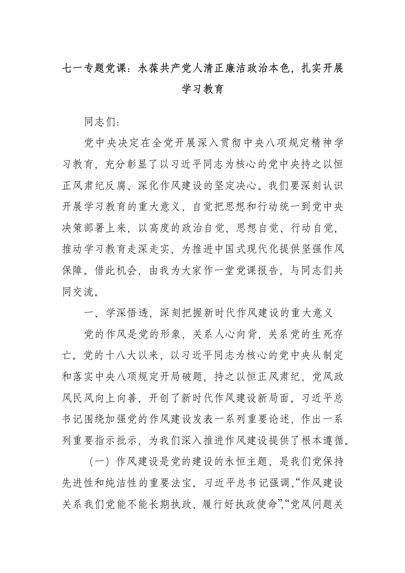 七一专题党课:永葆共产党人清正廉洁政治本色,扎实开展学习教育同志们:党中央决定在全党开展深入贯彻中央八项规定精神学习教育,充分彰显了以习近平同志为核心的党中央持之以恒正风肃纪反腐、深化作风建设的坚定决心。我们要深刻认识开展学习教育的重大意义,自觉把思想和行动统一到党中央决策部署上来,以高度的政治自觉、思想自觉、行动自觉,推动学习教育走深走实,为推进中国式现代化提供坚强作风保障。借此机会,由我为大家作一堂党课报告,与同志们共同交流。一、学深悟透,深刻把握新时代作风建设的重大意义党的作风是党的形象,关系人心向背,关系党的生死存亡。党的十八大以来,以习近平同志为核心的党中央从制定和落实中央八项规定开局破题,持之以恒正风肃纪,党风政风民风向上向善,开创了新时代作风建设新局面。习近平总书记围绕加强党的作风建设发表一系列重要论述,作出一系列重要指示批示,为我们深入推进作风建设提供了根本遵循。(一)作风建设是党的建设的永恒主题,是我们党保持先进性和纯洁性的重要法宝。习近平总书记强调,“作风建设关系我们党能不能长期执政、履行好执政使命”,“党风问题关系执政党的生死存亡”历史和现实表明,一个政党如果不注重作风建设,听任不正之风侵蚀党的肌体,就有失去民心、丧失政权的危险。党的十八大以来,党中央从制定和落实中央八项规定开局破题,持之以恒正风肃纪,党风政风民风向上向善,开创了新时代作风建设新局面。但也要清醒看到,“四风”问题树倒根存、顽固复杂,反弹回潮隐患犹存,必须时刻保持清醒头脑,以永远在路上的坚定和执着,坚决打好作风建设持久战。(二)密切联系群众是党的优良传统和最大政治优势。习近平总书记指出,“我们党的最大政治优势是密切联系群众,党执政后的最大危险是脱离群众”“作风问题,核心是党同人民群众的关系问题,必须坚持人民至上”我们党来自人民、植根人民、服务人民,一旦脱离群众,就会失去生命力。中央八项规定把改进调查研究、密切联系群众作为第一项内容,就是要引导党员干部牢记初心使命,坚持以人民为中心的发展思想,始终保持同人民群众的血肉联系。在新征程上,我们要始终把人民放在心中最高位置,想群众之所想、急群众之所急、解群众之所难,不断增强人民群众的获得感、幸福感、安全感。(三)作风建设是全面从严治党的重要内容和有力抓手。习近平总书记强调,“全面从严治党,核心是加强党的领导,基础在全面,关键在严,要害在治,“作风建设是永恒课题,