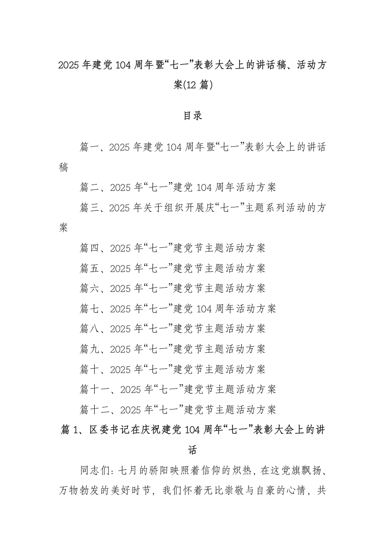 2025年建党104周年暨“七一”表彰大会上的讲话稿、活动方案(12篇)目录篇一、2025年建党104周年暨“七一”表彰大会上的讲话稿篇二、2025年“七一”建党104周年活动方案篇三、2025年关于组织开展庆“七一”主题系列活动的方案篇四、2025年“七一”建党节主题活动方案篇五、2025年“七一”建党节主题活动方案篇六、2025年“七一”建党节主题活动方案篇七、2025年“七一”建党104周年活动方案篇八、2025年“七一”建党节主题活动方案篇九、2025年“七一”建党节主题活动方案篇十、2025年“七一”建党节主题活动方案篇十一、2025年“七一”建党节主题活动方案篇十二、2025年“七一”建党节主题活动方案篇1、区委书记在庆祝建党104周年“七一”表彰大会上的讲话同志们:七月的骄阳映照着信仰的炽热,在这党旗飘扬、万物勃发的美好时节,我们怀着无比崇敬与自豪的心情,共同庆祝中国共产党成立104周年。在此,我谨代表区委,向荣获表彰的先进集体和优秀个人致以热烈祝贺,你们以实干担当树起了时代标杆;向奋战在全区各条战线的共产党员们致以崇高敬意,你们用汗水与智慧浇筑着城市发展的基石,是推动事业进步的先锋力量!104年前,中国共产党诞生于民族危亡之际,从嘉兴南湖的小小红船,到领航中国行稳致远的巍巍巨轮,党团结带领全国各族人民,历经革命、建设、改革各个历史时期,创造了无数的辉煌成就。回顾党的百年历程,我们更加深刻地认识到,没有共产党就没有新中国,就没有中华民族伟大复兴。党的坚强领导,是我们战胜一切艰难险阻、不断从胜利走向胜利的根本保证。XX擘画了全面建设社会主义现代化国家、全面推进中华民族伟大复兴的宏伟蓝图。站在新的历史起点上,我们必须坚定不移地以习近平新时代中国特色社会主义思想为指导,深入贯彻落实中央八项规定精神,以更加坚定的信心、更加昂扬的斗志、更加务实的作风,推动XX区各项事业高质量发展。今天,我们召开此次大会,既是对党的生日的深情纪念,也是对先进典型的隆重表彰,更是对全区党员干部的一次思想动员和作风洗礼。希望通过这次会议,缅怀先烈、学习先进、鼓舞士气,进一步激励全区各级党组织和广大党员干部,以先进为榜样,不忘初心、牢记使命,担当作为、砥砺前行,为建设更加美好的新城区而努力