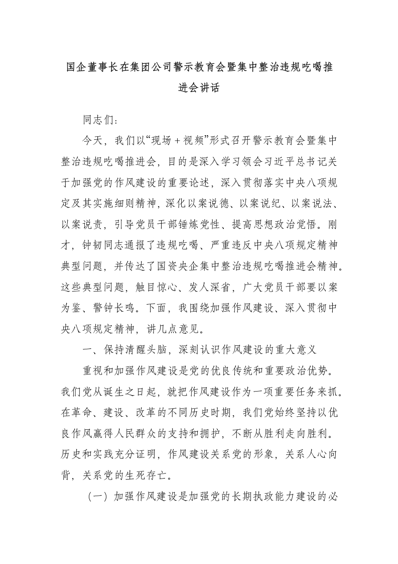 国企董事长在集团公司警示教育会暨集中整治违规吃喝推进会讲话同志们:今天,我们以“现场+视频”形式召开警示教育会暨集中整治违规吃喝推进会,目的是深入学习领会习近平总书记关于加强党的作风建设的重要论述,深入贯彻落实中央八项规定及其实施细则精神,深化以案说德、以案说纪、以案说法、以案说责,引导党员干部锤炼党性、提高思想政治觉悟。刚才,钟韧同志通报了违规吃喝、严重违反中央八项规定精神典型问题,并传达了国资央企集中整治违规吃喝推进会精神。这些典型问题,触目惊心、发人深省,广大党员干部要以案为鉴、警钟长鸣。下面,我围绕加强作风建设、深入贯彻中央八项规定精神,讲几点意见。一、保持清醒头脑,深刻认识作风建设的重大意义重视和加强作风建设是党的优良传统和重要政治优势。我们党从诞生之日起,就把作风建设作为一项重要任务来抓。在革命、建设、改革的不同历史时期,我们党始终坚持以优良作风赢得人民群众的支持和拥护,不断从胜利走向胜利。历史和实践充分证明,作风建设关系党的形象,关系人心向背,关系党的生死存亡。(一)加强作风建设是加强党的长期执政能力建设的必然要求党的执政能力不是与生俱来的,也不是一劳永逸的。只有坚持不懈加强作风建设,才能不断提高党的执政能力和领导水平,确保党始终成为中国特色社会主义事业的坚强领导核心。当前,我们党面临的“四大考验四种危险”依然复杂严峻,如果作风建设抓不好,就会严重削弱党的创造力、凝聚力、战斗力,动摇党的执政根基。我们必须深刻认识到,作风建设永远在路上,任何时候都不能松懈。(二)加强作风建设是加强党的先进性和纯洁性建设的重要内容党的先进性和纯洁性是党的生命所系、力量所在。作风问题本质上是党性问题,加强作风建设,就是要教育引导党员干部坚定理想信念,增强党性修养,保持党的先进性和纯洁性。只有保持优良的作风,才能赢得人民群众的信任和支持,才能始终保持党的先进性和纯洁性。我们要通过加强作风建设,引导党员干部树立正确的世界观、人生观、价值观,做到心中有党、心中有民、心中有责、心中有戒。(三)加强作风建设是推进中国式现代化的重要保障推进中国式现代化,是一项前无古人的伟大事业,需要我们付出长期艰苦的努力。只有保持优良的作风,才能激发广大党员干部的积极性、主动性、创造性,形成干事创业的强大合力。我们要深入学习贯彻习近平总书记关于加强党的