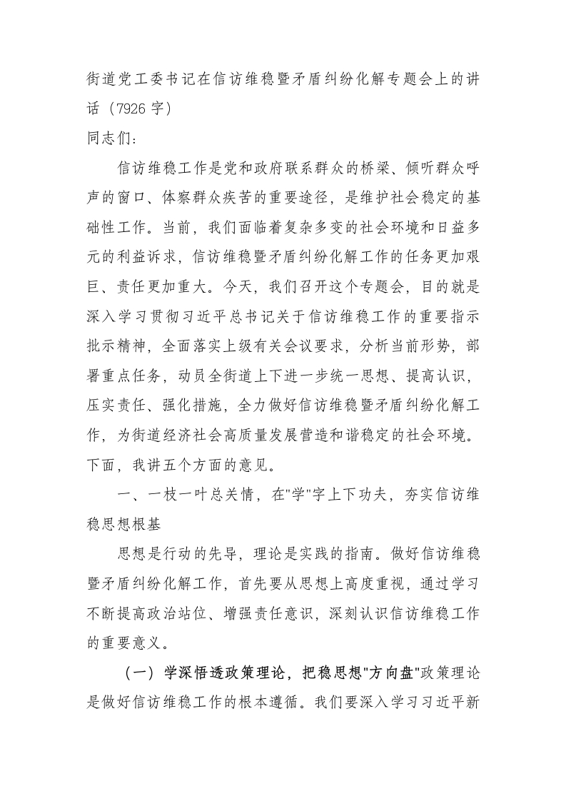 街道党工委书记在信访维稳暨矛盾纠纷化解专题会上的讲话(7926字)同志们:信访维稳工作是党和政府联系群众的桥梁、倾听群众呼声的窗口、体察群众疾苦的重要途径,是维护社会稳定的基础性工作。当前,我们面临着复杂多变的社会环境和日益多元的利益诉求,信访维稳暨矛盾纠纷化解工作的任务更加艰巨、责任更加重大。今天,我们召开这个专题会,目的就是深入学习贯彻习近平总书记关于信访维稳工作的重要指示批示精神,全面落实上级有关会议要求,分析当前形势,部署重点任务,动员全街道上下进一步统一思想、提高认识,压实责任、强化措施,全力做好信访维稳暨矛盾纠纷化解工作,为街道经济社会高质量发展营造和谐稳定的社会环境。下面,我讲五个方面的意见。一、一枝一叶总关情,在"学"字上下功夫,夯实信访维稳思想根基思想是行动的先导,理论是实践的指南。做好信访维稳暨矛盾纠纷化解工作,首先要从思想上高度重视,通过学习不断提高政治站位、增强责任意识,深刻认识信访维稳工作的重要意义。(一)学深悟透政策理论,把稳思想"方向盘"政策理论是做好信访维稳工作的根本遵循。我们要深入学习习近平新时代中国特色社会主义思想,特别是习近平总书记关于加强和改进人民信访工作的重要思想,深刻领会其核心要义、精神实质、丰富内涵和实践要求,切实把思想和行动统一到党中央关于信访维稳工作的决策部署上来。一是聚焦核心,深学细研党中央决策部署。党的十八大以来,以习近平同志为核心的党中央高度重视信访工作,作出一系列重要指示批示,为做好新时代信访工作提供了根本指针。我们要原原本本学习《信访工作条例》,深刻理解信访工作是党的群众工作的重要组成部分,是了解民情、集中民智、维护民利、凝聚民心的一项重要工作,准确把握新时代信访工作的原则和要求,始终坚持以人民为中心的发展思想,把群众的利益放在首位,带着感情和责任做好信访工作。二是结合实际,精准把握本地政策文件精神。上级党委、政府针对信访维稳工作出台了一系列政策文件和工作方案,这些都是我们开展工作的具体依据。我们要结合街道实际,认真学习领会,准确把握政策界限和工作要求,确保各项政策措施在街道落地生根、见到实效。比如,对于涉及征地拆迁、社会保障、环境保护等重点领域的政策文件,要组织专门力量进行深入研究,全面掌握政策内容,积极向群众做好宣传解释工作,引导群众依法合理表达诉求。三是联系群众,深刻理解信访工作本质要求。信访工作的本质是群众工作,核心是为群众排忧解难。我们要从巩固党的执政基础、维护社会和谐稳定的高度,深刻认