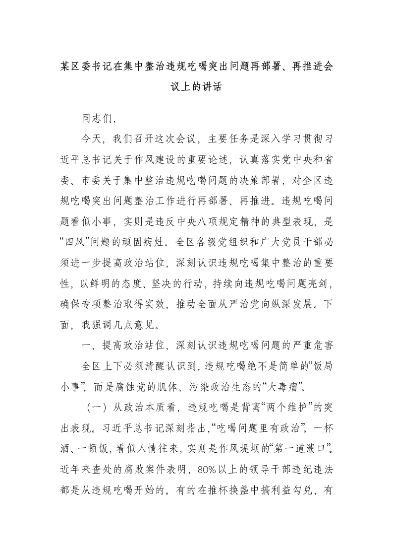 某区委书记在集中整治违规吃喝突出问题再部署、再推进会议上的讲话同志们,今天,我们召开这次会议,主要任务是深入学习贯彻习近平总书记关于作风建设的重要论述,认真落实党中央和省委、市委关于集中整治违规吃喝问题的决策部署,对全区违规吃喝突出问题整治工作进行再部署、再推进。违规吃喝问题看似小事,实则是违反中央八项规定精神的典型表现,是“四风”问题的顽固病灶。全区各级党组织和广大党员干部必须进一步提高政治站位,深刻认识违规吃喝集中整治的重要性,以鲜明的态度、坚决的行动,持续向违规吃喝问题亮剑,确保专项整治取得实效,推动全面从严治党向纵深发展。下面,我强调几点意见。一、提高政治站位,深刻认识违规吃喝问题的严重危害全区上下必须清醒认识到,违规吃喝绝不是简单的“饭局小事”而是腐蚀党的肌体、污染政治生态的“大毒瘤”(一)从政治本质看,违规吃喝是背离“两个维护”的突出表现。习近平总书记深刻指出,“吃喝问题里有政治。一杯酒、一顿饭,看似人情往来,实则是作风堤坝的“第一道渍口”近年来查处的腐败案件表明,80%以上的领导干部违纪违法都是从违规吃喝开始的。有的在推杯换盏中搞利益勾兑,有的在觥筹交错中形成小圈子,最终沦为权力寻租、权钱交易的“俘虏”。中央纪委曝光的典型案例中,某地领导干部长期接受管理服务对象宴请,从吃请到收礼,从帮忙到受贿,一步步滑向深渊。这警示我们,“舌尖上的腐败"”本质是政治问题,是对党不忠诚、不老实的具体表现。如果连“吃”这一关都守不住,何谈捍卫“两个确立”践行“两个维护”?(二)从政治危害看,违规吃喝是破坏政治生态的“污染源”。其一,它扭曲公平正义。当项目审批、资金分配在酒桌上“暗箱操作”规则就成了摆设,实干者寒心,投机者得利。其二,它助长圈子文化。一些干部把“谁请客、谁参加”作为划线的标准,形成“饭局同盟”,党内同志关系异化为江湖义气。其三,它透支群众信任。群众的眼睛是雪亮的,当干部整天出入高档酒楼,喝的是酒,丢的是民心!某地巡察发现,一个部门连续三年餐饮开支超预算200%,同期群众投诉该部门“门难进、脸难看”的问题激增。这就是作风渍败的连锁反应,吃喝风不止,党的执政根基就会动摇。(三)从政治责任看,整治违规吃喝是必须打赢的攻坚战。当前,仍有少数干部存在“三个误区”,认为“吃喝是人之常情”把禁令当“耳旁风?借口“招商引资需要,搞变通打擦边球;甚至错误认为“法不责众”,心存侥幸。这些思想本质上都是政治意识淡薄、党性原则缺失的表现。区委明确要求,各级党组织要把专项整治作为检验政治判断力、政治领悟力、