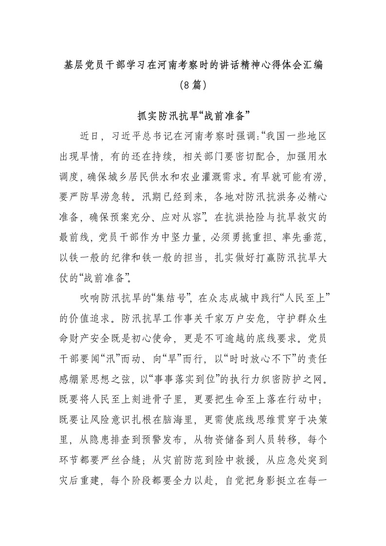 基层党员干部学习在河南考察时的讲话精神心得体会汇编(8篇)抓实防汛抗旱“战前准备”近日,习近平总书记在河南考察时强调:“我国一些地区出现旱情,有的还在持续,相关部门要密切配合,加强用水调度,确保城乡居民供水和农业灌溉需求。有旱就可能有涝,要严防旱涝急转。汛期已经到来,各地对防汛抗洪务必精心准备,确保预案充分、应对从容。在抗洪抢险与抗旱救灾的最前线,党员干部作为中坚力量,必须勇挑重担、率先垂范,以铁一般的纪律和铁一般的担当,扎实做好打赢防汛抗旱大仗的“战前准备”吹响防汛抗旱的“集结号”,在众志成城中践行“人民至上”的价值追求。防汛抗旱工作事关千家万户安危,守护群众生命财产安全既是初心使命,更是不可逾越的底线要求。党员干部要闻“汛”而动、向“旱”而行,以“时时放心不下”的责任感绷紧思想之弦,以“事事落实到位”的执行力织密防护之网。既要将人民至上刻进骨子里,更要把生命至上落在行动中;既要让风险意识扎根在脑海里,更需使底线思维贯穿于决策里,从隐患排查到预警发布,从物资储备到人员转移,每个环节都要严丝合缝;从灾前防范到险中救援,从应急处突到灾后重建,每个阶段都要全力以赴,自觉把身影挺立在每一个危险前沿。要以“春风化雨润无声”的温情贴近群众,走遍受灾户的门槛,听清每声叹息里的诉求,握紧每双颤抖的手传递力量,把安置点的床铺铺得更暖,把救灾粮的分发做得更细,全力以赴把人民群众关心关切的事情做得更好、更周全。发出履职尽责的“动员令”,在攻坚克难中锤炼“敢打必胜”的使命担当。担当作为是党员干部的政治本色和根本职责。当前我国已进入汛期,防汛抗旱工作面临严峻考验,这既是对党员干部政治品格、宗旨意识的现实检验,更是锤炼担当精神的实践考场。党员干部必须牢固树立“防大汛、抗大旱、抢大险、救大灾”的底线思维,始终保持高度警觉,做到闻令而动、听令而行。要严格落实防汛抗旱责任制,构建横向到边、纵向到底的责任体系,确保每个环节有人抓、每项工作有人管。要健全完善应急指挥机制,强化监测预警、会商研判和科学调度,做到险情早发现、早处置。要发扬钉钉子精神,以严明的纪律保障各项措施落地见效,在实战中锤炼“召之即来、来之能战、战之必胜”的过硬本领,在防汛抗旱这场大考中彰显共产党人的初心使命,让担当作为成为新时代党员干部最鲜明的精神标识。守牢主动作为的“主阵地”,在同舟共济中筑牢“严防死守”的安全堤坝。防汛抗旱既是应急大考,更是治理能力的综合检验。答好防汛抗旱这道“必答题”必须坚持预防为主、防