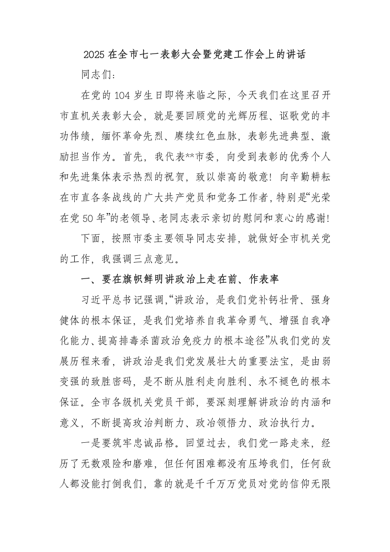 2025在全市七一表彰大会暨党建工作会上的讲话同志们:在党的104岁生日即将来临之际,今天我们在这里召开市直机关表彰大会,就是要回顾党的光辉历程、讴歌党的丰功伟绩,缅怀革命先烈、赓续红色血脉,表彰先进典型、激励担当作为。首先,我代表*市委,向受到表彰的优秀个人和先进集体表示热烈的祝贺,致以崇高的敬意!向辛勤耕耘在市直各条战线的广大共产党员和觉务工作者,特别是“光荣在党50年”的老领导、老同志表示亲切的慰间和衷心的感谢!下面,按照市委主要领导同志安排,就做好全市机关党的工作,我强调三点意见。一、要在旗帜鲜明讲政治上走在前、作表率习近平总书记强调,“讲政治,是我们党补钙壮骨、强身健体的根本保证,是我们党培养自我革命勇气、增强自我净化能力、提高排毒杀菌政治免疫力的根本途径”从我们党的发展历程来看,讲政治是我们党发展壮大的重要法宝,是由弱变强的致胜密码,是不断从胜利走向胜利、永不褪色的根本保证。全市各级机关党员干部,要深刻理解讲政治的内涵和意义,不断提高玫治判断力、政冶领悟力、政治执行力。一是要筑牢忠诚品格。回望过去,我们党一路走来,经历了无数艰险和磨难,但任何困难都没有压垮我们,任何敌人都没能打倒我们,靠的就是千千万万党员对党的信仰无限忠诚,例如,董存瑞舍身炸硼堡、黄继光用身体堵枪眼,等等许多革命英雄,用自已的生命诊释对党的忠诚。新时代的党员干部,必须把对党绝对忠诚作为政治灵魂、作为根本玫治要求。要全心全意讲忠诚,在对党忠诚上不惨任何杂质,始终如一、无怨无悔,任何时候任何情况下都不改其心、不移其志、不毁其节。要坚定立场讲忠诚,把对党绝对忠诚融入血脉灵魂,增强“四个意识”坚定“四个自信”、做到“两个维护”,确保在思想上、政治上、行动上同以习近平同志为核心的党中央保持高度一致。要知行合一讲忠诚,对党绝对忠诚是政治标准,更是实践要求,既看政治态度更看实际行动,必须把对党绝对忠诚作为一切工作的生命线和根本点。二是要坚定理想信念。习近平总书记指出,“中国共产党之所以叫共产党,就是因为从成立之日起我们党就把共产主义确立为远大理想。砍头不要紧,只要主义真"的夏明翰、“心里装着全体人民,唯独没有他自己"的县委书记焦裕禄等一代代中国共产党人,以信仰为基,投身革命、建设、改革事业,把理想信念转化为报国为民行动,生动诠释了对马克思主义的坚定信仰、对共产主义和社会主义的执着信念,对党和人民的无比忠诚。新时代党员干部,要坚持用理想信念进行自我净化、自我革新和自我提高,解决好世界观、人生观、价值观“总开关”间题,做到虔诚而执着、至信而深厚。特别是今年,市直机关部署了开设“红色课堂”诵读“红色经典”宣