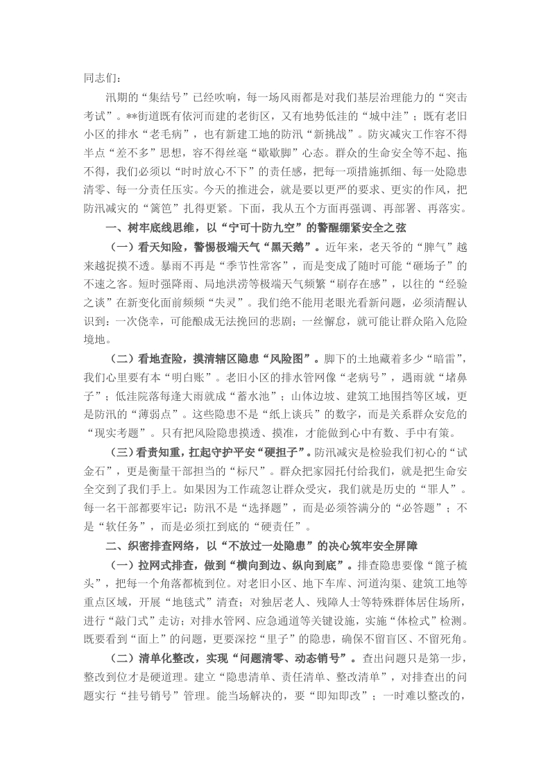 同志们:汛期的“集结号”已经吹响,每一场风雨都是对我们基层治理能力的“突击考试”。**街道既有依河而建的老街区,又有地势低洼的“城中洼”;既有老旧小区的排水“老毛病”,也有新建工地的防汛“新挑战”。防灾减灾工作容不得半点“差不多”思想,容不得丝毫“歇歇脚”心态。群众的生命安全等不起、拖不得,我们必须以“时时放心不下”的责任感,把每一项措施抓细、每一处隐患清零、每一分责任压实。今天的推进会,就是要以更严的要求、更实的作风,把防汛减灾的“篱笆”扎得更紧。下面,我从五个方面再强调、再部署、再落实。一、树牢底线思维,以“宁可十防九空”的警醒绷紧安全之弦(一)看天知险,警惕极端天气“黑天鹅”。近年来,老天爷的“脾气”越来越捉摸不透。暴雨不再是“季节性常客”,而是变成了随时可能“砸场子”的不速之客。短时强降雨、局地洪涝等极端天气频繁“刷存在感”,以往的“经验之谈”在新变化面前频频“失灵”。我们绝不能用老眼光看新问题,必须清醒认识到:一次侥幸,可能酿成无法挽回的悲剧;一丝懈怠,就可能让群众陷入危险境地。(二)看地查险,摸清辖区隐患“风险图”。脚下的土地藏着多少“暗雷”,我们心里要有本“明白账”。老旧小区的排水管网像“老病号”,遇雨就“堵鼻子”:低洼院落每逢大雨就成“蓄水池”:山体边坡、建筑工地围挡等区域,更是防汛的“薄弱点”。这些隐患不是“纸上谈兵”的数字,而是关系群众安危的“现实考题”。只有把风险隐患摸透、摸准,才能做到心中有数、手中有策。(三)看责知重,扛起守护平安“硬担子”。防汛减灾是检验我们初心的“试金石”,更是衡量干部担当的“标尺”。群众把家园托付给我们,就是把生命安全交到了我们手上。如果因为工作疏忽让群众受灾,我们就是历史的“罪人”。每一名干部都要牢记:防汛不是“选择题”,而是必须答满分的“必答题”:不是“软任务”,而是必须扛到底的“硬责任”。二、织密排查网络,以“不放过一处隐患”的决心筑牢安全屏障(一)拉网式排查,做到“横向到边、纵向到底”。排查隐患要像“篦子梳头”,把每一个角落都梳到位。对老旧小区、地下车库、河道沟渠、建筑工地等重点区域,开展“地毯式”清查:对独居老人、残障人士等特殊群体居住场所,进行“敲门式”走访:对排水管网、应急通道等关键设施,实施“体检式”检测。既要看到“面上”的问题,更要深挖“里子”的隐患,确保不留盲区、不留死角。(二)清单化整改,实现“问题清零、动态销号”。查出问题只是第一步,整改到位才是硬道理。建立“隐患清单、责任清单、整改清单”,对排查出的问题实行“挂号销号”管理。能当场解决的,要“即知即改”;一时难以整改的,要设置警示标识,落实临时防范措施:需要多部门协同的,要明确牵头单位,限时办结。定期开展“回头看”,防止问题“反弹回潮”。(三)全民化参与,凝聚“人人尽责、共建平安”合力。群众是防汛的“第一道防线”。通过微信群、大喇叭、宣传栏等载体,发动居民主动排查身边隐患:设立“防汛隐患随手拍”平台,对提供有效线索的群众给予奖励:组织楼长、网格员、志愿者成立“民间巡查队”,让每一位居民都成为防汛的“瞭望哨”“吹哨人”,构筑起群防群治的坚固防线。三、夯实应急根基,以“宁可备而不用”的准备提升处置能力(一)完善预案体系,确保“一险一策、精准应对”。应急预案不是“一纸空文”,必须贴合实际、管用实用。针对内涝、山体滑坡、房屋坍塌等不同险情,制定“场景化”“实操性”预案,细化预警发布、人员转移、抢险救援等环节的具体流程。建立“街道一社区一网格”三级联动机制,明确每一个岗位、每一个人的职责,确保关键时刻“人人知道干什么、怎么干”。(二)备足物资力量,做到“宁可十防九空、不可失防万一”。应急物资是抢险救灾的“弹药粮草”。按照“重点区域优先、薄弱环节加强”原则,在各社区设立应急物资储备点,足量储备沙袋、抽水泵、救生衣、应急照明等物资:与周边商超、企业签订物资储备协议,确保关键时刻“调得出、运得到、用得上”。对应急队伍开展“实战化”演练,模拟不同场景下的抢险救援,锤炼队伍的快速反应和协同作战能力。(三)畅通预警渠道,实现“信息直达、不漏一人”。预警信息传递必须像“闪电”一样快。建立“气象预警一街道响应一社区落实”的快速传导机制,通过短信、微信群、社区广播等多渠道发布预警:针对孤寡老人、留守儿童等特殊群体,安排专人“一对一”通知:在危险区域设置电子显示屏、高音喇叭,确保预警信息“传得快、听得见、看得懂”。四、强化协同联动,以“一盘棋”的思维凝聚工作合力(一)部门联动,打破“各自为战”壁垒。防汛不是某个部门的“独角戏”,而是各单位的“大合唱”。城建部门要当好“管网医生”,确保排水系统畅通:民政部门要做好“后勤部长”,保障受灾群众安置:卫健部门要当好“生命卫士”,提供医疗救援保障。建立部际联席会议制度,定期会商研判,共享信息资源,形成“齐抓共管、协同作战”的工作格局。(二)区域联动,构建“守望相助”格局。与周边街道、社区建立“防汛联盟”,签订互助协议。遇到重大险情,实现“信息互通、物资互济