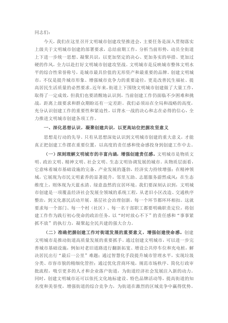 同志们:今天,我们在这里召开文明城市创建攻坚推进会,主要任务是深入贯彻落实上级关于文明城市创建的部署要求,总结前期工作,分析当前形势,动员全街道上下进一步统一思想、凝聚共识,以更加坚定的决心、更加务实的举措、更加过硬的作风,全力以赴打好文明城市创建攻坚战。文明城市是反映城市整体文明水平的综合性荣誉称号,是城市最具价值的无形资产和最重要的品牌。创建文明城市,不仅是提升城市形象、增强城市竞争力的重要途径,更是改善民生福祉、提高居民生活质量的必然要求。近年来,街道上下围绕文明城市创建做了大量工作,取得了一定成效,但我们也要清醒地认识到,当前创建工作仍面临不少困难和挑战,距离上级要求和群众期盼还有一定差距。我们必须站在全局和战略的高度,充分认识创建工作的重要性和紧迫性,以背水一战的决心和志在必得的信心,全力推进文明城市创建各项工作。一、深化思想认识,凝聚创建共识,以更高站位把握攻坚意义思想是行动的先导。只有从思想深处认识到文明城市创建的重大意义,才能真正把创建工作摆在重要位置,以高度的责任感和使命感投身到创建工作中去。(一)深刻理解文明城市的丰富内涵,增强创建责任感。文明城市是物质文明、政治文明、精神文明、社会文明、生态文明协调发展的城市。从物质层面看,它意味着城市基础设施的完备、产业发展的蓬勃,经济实力持续增强:在精神领域,它展现为市民文明素养的显著提升,邻里互助、志愿服务蔚然成风:在生态维度上,则体现为天蓝水清、绿意盎然的宜居环境。我们要深刻认识到,文明城市创建是一项覆盖经济社会发展全领域的系统工程,从老旧小区改造、交通秩序整治,到文化惠民活动开展、基层社会治理创新,每一个环节都环环相扣。这就要求每一个部门、每一个村(社区)、每一名干部职工都要明确职责定位,将创建工作作为践行初心使命的政治任务,以“时时放心不下”的责任感和“事事紧抓不放”的执行力,凝聚起全民共建的强大合力。(二)准确把握创建工作对街道发展的重要意义,增强创建使命感。创建文明城市是推动街道高质量发展的重要抓手。通过创建文明城市,可以进一步完善城市基础设施,例如对老旧道路进行翻新拓宽、增设公共停车位和充电桩,解决居民出行“最后一公里”难题:通过智慧化手段提升城市管理水平,实现垃圾分类、市容市貌的精细化管控:通过优化营商环境,规范市场秩序、简化行政审批流程,吸引更多的人才和企业落户街道,为街道经济社会发展注入新的动力。同时,创建文明城市还可以依托文化地标建设、特色品牌活动等,提高街道的知名度和美誉度,增强街道的综合竞争力,为街道在激烈的区域竞争中赢得优势。我们要充分认识到创建工作对街道发展的重要性,将创建工作与街道的中心工作紧密结合起来,以创建促发展,以发展强创建,推动街道各项工作再上新台阶。(三)充分认识创建成果对居民生活的积极影响,增强创建紧迫感。创建文明城市的最终目的是让居民生活得更加美好。文明城市创建可以改善居民的居住环境,提高居民的生活质量,增强居民的幸福感和获得感。同时,创建文明城市还可以提升居民的文明素质和道德水平,营造良好的社会风尚,让居民在文明和谐的社会环境中生活和工作。我们要始终坚持以人民为中心的发展思想,把居民的需求作为创建工作的出发点和落脚点,想居民之所想,急居民之所急,切实解决居民关心的热点难点问题,让居民在创建工作中得到实实在在的好处。当前,创建工作已经进入攻坚阶段,时间紧迫,任务艰巨。我们要以时不我待的紧迫感和只争朝夕的精神,迅速行动起来,全力以赴做好创建各项工作,确保创建目标如期实现二、明确目标任务,聚焦关键环节,以更准方向锚定攻坚重点目标就是方向,重点就是关键。我们要紧紧围绕文明城市创建的目标任务,聚焦关键环节,突出工作重点,精准发力,靶向施策,确保创建工作取得实效。(一)紧盯环境整治,打造整洁有序的市容市貌。环境是城市的“面子”,直接反映城市的文明程度。我们要以环境卫生整治为突破口,全面提升城市环境质量。一是加强市容市貌管理。组建专项巡查小组,采取“日常巡查+突击检查”相结合的方式,对占道经营、乱摆乱放、乱贴乱画等不文明行为进行动态监管,对屡教不改者依法依规严肃处理:建立户外广告全流程审核机制,规范广告设置标准,确保广告内容健康、形式美观:对建筑工地、拆迁工地实行动态管理,要求施工方严格落实围挡设置、洒水降尘等措施,确保施工现场整洁有序。二是推进环境卫生精细化保洁。持续加大环卫设施投入,逐步更新老旧设备,引进先进的扫地车、洒水车等机械化保洁设备,提高保洁效率:针对背街小巷、老旧小区、城乡接合部等薄弱环节,制定“一点一策”保洁方案,增加保洁频次,延长保洁时间,确保垃圾日产日清,不留卫生死角。同时,建立群众监督反馈机制,及时处理环境卫生问题。三是加强生态环境治理。聚焦大气、水、土壤污染防治,强化多部门协同联动,建立污染源动态监测体系,对重点企业、重点区域进行实时监控:全面推进河道、湖泊综合治理,实施清淤疏浚、生态修复工程:大力推进绿化亮化工程,科学规划城市绿地,打造一批城市“口袋公园”,合理布局景观