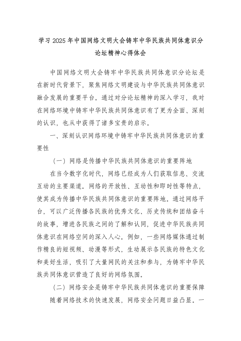 学习2025年中国网络文明大会铸牢中华民族共同体意识分论坛精神心得体会中国网络文明大会铸牢中华民族共同体意识分论坛是在新时代背景下,聚焦网络文明建设与中华民族共同体意识融合发展的重要平台。通过对分论坛精神的深入学习,我对在网络环境中铸牢中华民族共同体意识有了更为全面、深刻的认识,也从中获得了诸多宝贵的启示。一、深刻认识网络环境中铸牢中华民族共同体意识的重要性(一)网络是传播中华民族共同体意识的重要阵地在当今数字化时代,网络已经成为人们获取信息、交流互动的主要渠道。网络的开放性、互动性和即时性等特点,使其成为传播中华民族共同体意识的重要阵地。通过网络平台,可以广泛传播各民族的优秀文化、历史传统和团结奋斗的故事,增进各民族之间的了解和认同,促进中华民族共同体意识在网络空间的深入人心。例如,一些网络煤体通过制作精良的短视频、动漫等形式,生动展示各民族的特色文化和美好生活,吸引了大量网民的关注和参与,为铸牢中华民族共同体意识营造了良好的网络氛围。(二)网络安全是铸牢中华民族共同体意识的重要保障随着网络技术的快速发展,网络安全问题日益凸显。一些别有用心的势力利用网络平台进行分裂、破坏活动,传播有害思想和信息,企图破坏国家的统一和民族团结。因此,维护网络安全,防止有害信息的传播,是铸牢中华民族共同体意识的重要保障。我们要加强网络安全管理,建立健全网络安全防护体系,加强对网络信息的监管和审查,及时发现和处理各类网络安全隐患,为铸牢中华民族共同体意识创造安全稳定的网络环境。(三)网络文明是铸牢中华民族共同体意识的重要支撑网络文明是网络空间的精神风貌和行为准则,它体现了网络社会的价值取向和道德规范。在网络环境中铸牢中华民族共同体意识,需要营造文明、和谐、健康的网络氛围。我们要倡导文明上网、理性发言,弘扬正能量,抵制低俗、暴力、虚假等不良信息,共同构建清朗的网络空间。同时,要加强网络文明建设,开展网络文明宣传教育活动,提高网民的文明素质和道德水平,使网络成为传播中华民族共同体意识的文明高地。二、准确把握分论坛精神对铸牢中华民族共同体意识的新要求(一)强化网络空间的中华民族共同体意识教育分论坛强调要加强网络空间的中华民族共同体意识教育,通过网络平台开展形式多样的教育活动,引导广大网民树立正确的国家观、民族观、历史观、文化观、宗教观。要