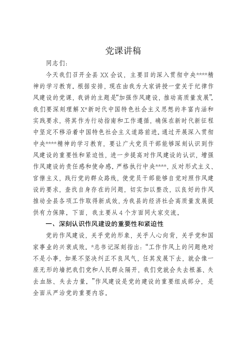 党课讲稿同志们:今天我们召开全县X会议,主要目的深入贯彻中央*精神的学习教育。根据安排,现在由我为大家讲授一堂关于纪律作风建设的党课,我讲的主题是“加强作风建设,推动高质量发展”。我们要深刻理解X*新时代中国特色社会主义思想的丰富内涵和实践要求,将其作为行动指南和工作遵循,确保在新时代新征程中坚定不移沿着中国特色社会主义道路前进。通过开展深入贯彻中央*精神的学习教育,要让广大党员干部能够深刻认识到作风建设的重要性和紧迫性,进一步提高对作风建设的认识,增强作风建设的责任感和使命感。严格执行中央*,反对形式主义、官僚主义,践行党的群众路线,使党员干部能够自觉对照作风建设的要求,查找自身存在的问题,切实加以整改,以良好的作风推动全县各项工作取得新成效,为我县的经济社会高质量发展提供有力保障。下面,我主要从4个方面同大家交流。一、深刻认识作风建设的重要性和紧迫性党的作风建设,关乎党的形象,关乎人心向背,关乎党和国家事业的兴衰成败。*总书记深刻指出:“工作作风上的问题绝对不是小事,如果不坚决纠正不良风气,任其发展下去,就会像一座无形的墙把我们党和人民群众隔开,我们党就会失去根基、失去血脉、失去力量。”作风建设是党的建设的重要组成部分,是全面从严治党的重要内容。(一)从党的形象塑造角度来看,党的作风就是党的一张“名片”。作风优良,党在人民群众心中就是一支纪律严明、全心全意为人民服务的先进队伍。革命战争年代,无数党员干部与战士们同甘共苦,“三大纪律八项注意”严格执行,不拿群众一针一线,睡马路、啃干粮,正是靠着这样清正廉洁、艰苦奋斗的优良作风,赢得了人民群众的衷心拥护,老百姓心甘情愿地为党送粮送衣、掩护伤员,成为党坚实的后盾。在和平建设时期以及当下的新时代,如果党员干部们能够秉持求真务实、勤勉敬业的作风,在工作中不推诿、不敷衍,脚踏实地地为地方谋发展、为群众解难题,那么党在人民心中就是有担当、可信赖的引领者形象。相反,一旦出现形式主义、官僚主义等不良作风,诸如只重表面文章、脱离群众高高在上等情况,就会极大地损害党的形象,让群众对党产生质疑与疏离感。(二)从人心向背的角度而言,党的作风建设直接决定着能否凝聚起最广大人民群众的力量。人民群众是历史的创造者,党只有紧紧依靠人民才能不断取得胜利。当党员干部们深入基层,倾听群众的呼声,切实关心群众的衣食住行、生老病死等切身利益,以良好的作风将党的温暖传递给每一个人,群众就会感受到党是和他们站在一起的,从而愿意积极响应党的号召,参与到国家建设的各项事业中来。在乡村振兴工作中,数百万党员干部扎根乡村地区,风里来雨里去,帮助群众发展产业、改善生活条件,用扎实的工作作风换来了乡村旧貌换新颜,也让群众对党充满感