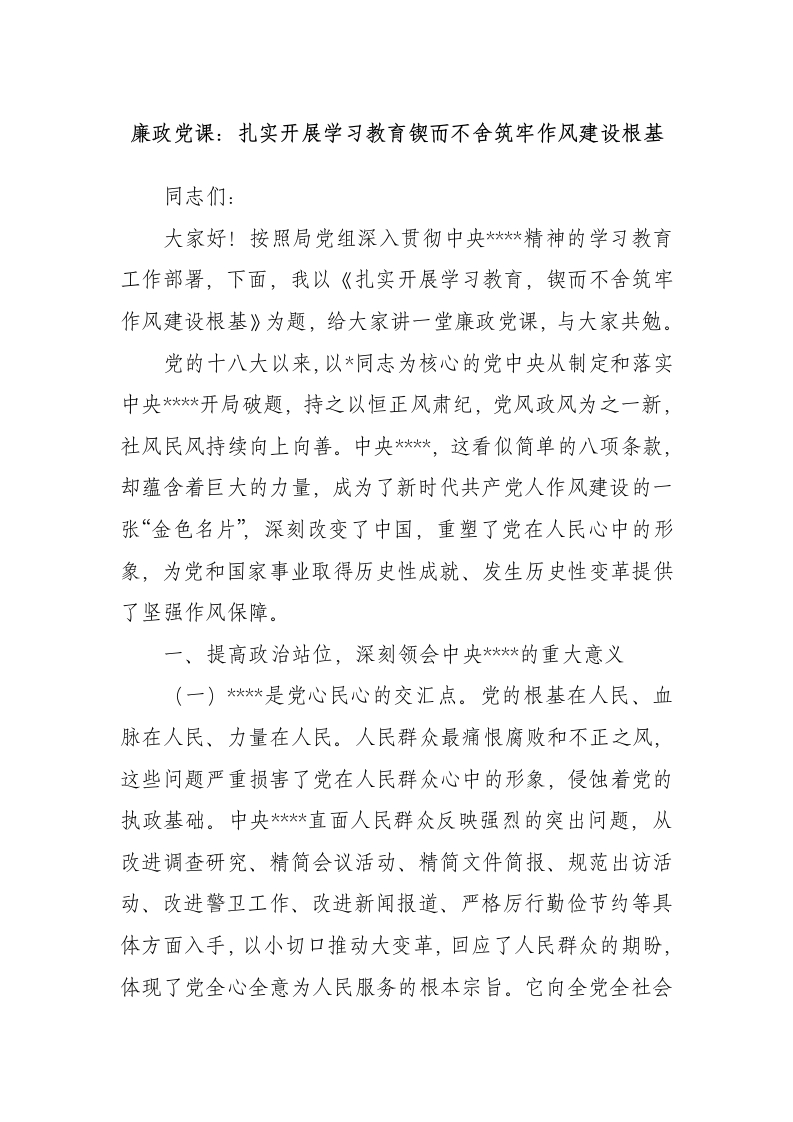廉政党课:扎实开展学习教育锲而不舍筑牢作风建设根基同志们:大家好!按照局党组深入贯彻中央*精神的学习教育工作部署,下面,我以《扎实开展学习教育,锲而不舍筑牢作风建设根基》为题,给大家讲一堂廉政党课,与大家共勉。党的十八大以来,以*同志为核心的党中央从制定和落实中央**开局破题,持之以恒正风肃纪,党风政风为之一新,社风民风持续向上向善。中央**,这看似简单的八项条款,却蕴含着巨大的力量,成为了新时代共产党人作风建设的一张“金色名片”,深刻改变了中国,重塑了党在人民心中的形象,为党和国家事业取得历史性成就、发生历史性变革提供了坚强作风保障。一、提高政治站位,深刻领会中央**的重大意义(一)*是党心民心的交汇点。党的根基在人民、血脉在人民、力量在人民。人民群众最痛恨腐败和不正之风,这些问题严重损害了党在人民群众心中的形象,侵蚀着党的执政基础。中央*直面人民群众反映强烈的突出问题,从改进调查研究、精简会议活动、精简文件简报、规范出访活动、改进警卫工作、改进新闻报道、严格厉行勤俭节约等具体方面入手,以小切口推动大变革,回应了人民群众的期盼,体现了党全心全意为人民服务的根本宗旨。它向全党全社会释放出强烈信号。中国共产党是全心全意为人民服务的政党,始终把人民利益放在首位,坚决与不良作风作斗争。这一举措赢得了人民群众的衷心拥护和支持,让党心民心更加紧密地联系在一起,为党和国家事业发展凝聚起了强大的民心力量。(二)*是全面从严治党的突破口。全面从严治党是党的十八大以来党中央作出的重大战略部署。中央**的出台,拉开了全面从严治党的大幕。它以作风建设为切入点,从党员干部的日常行为规范抓起,以“抓铁有痕、踏石留印”的坚韧和执着,坚决整治“四风”问题,使党员干部的纪律意识、规矩意识明显增强,工作作风显著改进。通过落实**,逐步完善党内法规制度体系,加强党内监督,严肃党内政治生活,推动全面从严治党向纵深发展。**成为了全面从严治党的重要抓手,为解决党内存在的其他问题创造了有利条件,为新时代党的建设新的伟大工程奠定了坚实基础。(三)*是党长期执政的重要保障。作风建设关系党的生死存亡,关系国家的长治久安。一个政党如果作风不正,就会失去人民群众的信任和支持,就难以长期执政。中央*的实施,有效遏制了不良作风的蔓延,净化了党内政治生态,提高了党的凝聚力、战斗力和领导力、号召力。它促使党员干部始终保持清醒头脑,牢记初心使命,做到廉洁奉公、勤勉敬业,为党长期执政提供了坚实的作风保障。只有坚持不
