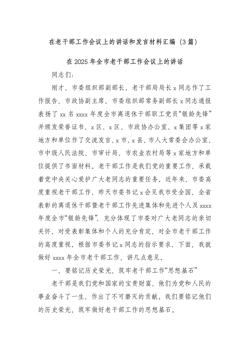 在老干部工作会议上的讲话和发言材料汇编(3篇)在2025年全市老干部工作会议上的讲话同志们:刚才,市委组织部副部长、老干部局局长x同志作了工作报告,市政协副主席、市委组织部常务副部长x同志通报表扬了双名xxx年度全市离退休干部职工党员“银龄先锋”并颁发荣誉证书,x区、x区、市政协办公室、x集团等x家地方和单位作了交流发言,x市、x县、市人大常委会办公室、市中级人民法院、市审计局、市农业农村局等x家地方和单位提供了书面材料。老干部工作是我们党的重要工作,承载着党中央关心爱护广大老同志的重要任务。近年来,市委高度重视老干部工作,昨天市委书记x会见我市受全国、全省表彰的离退休干部暨老干部工作先进集体和先进个人及xx年度全市“银龄先锋”,充分体现了市委对广大老同志的亲切关怀,对受表彰集体和个人的充分肯定,对全市老干部工作的高度重视。根据市委书记x同志的指示要求,下面,我就做好xxx年全市老干部工作,讲几点意见。一、要铭记历史荣光,筑牢老干部工作“思想基石”老干部是我们党和国家的宝贵财富,他们为党和人民的事业奋斗了一生,作出了不可磨灭的贡献。我们要铭记他们的历史荣光,筑牢做好老干部工作的思想基石。(一)要铭记历史功绩,常怀感恩之心。“吃水不忘挖井人。”广大老干部在革命、建设、改革的各个历史时期,为x的发展奉献了青春和热血。他们有的在战争年代浴血奋战,为新中国的成立立下赫赫战功;有的在和平时期艰苦奋斗,为x的经济社会发展添砖加瓦。各级党委(党组)要认真学习贯彻习近平总书记关于老干部工作的重要指示批示精神,把尊重老干部、爱护老干部当作一种政治自觉和责任担当。要始终牢记老干部的历史功绩,以饮水思源的感恩之心对待老干部,让他们感受到党和人民的关怀与温暖。只有常怀感恩之心,我们才能真正把老干部工作做好,不辜负他们的期望。(二)要学习崇高品格,坚定理想信念。“榜样的力量是无穷的。”老干部们身上有着坚定的理想信念、高尚的道德情操和无私的奉献精神。他们是习近平新时代中国特色社会主义思想的坚定信仰者、忠实践行者。我们要认真学习老干部的崇高品格,从他们身上汲取精神力量,坚定自己的理想信念。要把学习老干部的崇高品格与加强党性修养结合起来,不断提高自身的政治素质和道德水平。只有坚定理想信念,我们才能在老干部工作中保持正确的方向,为老干部提供更好的服务。(三)要发挥优势作用,凝聚银发力量。“莫道桑榆晚,为霞尚满天。”老干部有着丰富的经验、深厚的智慧和广泛的