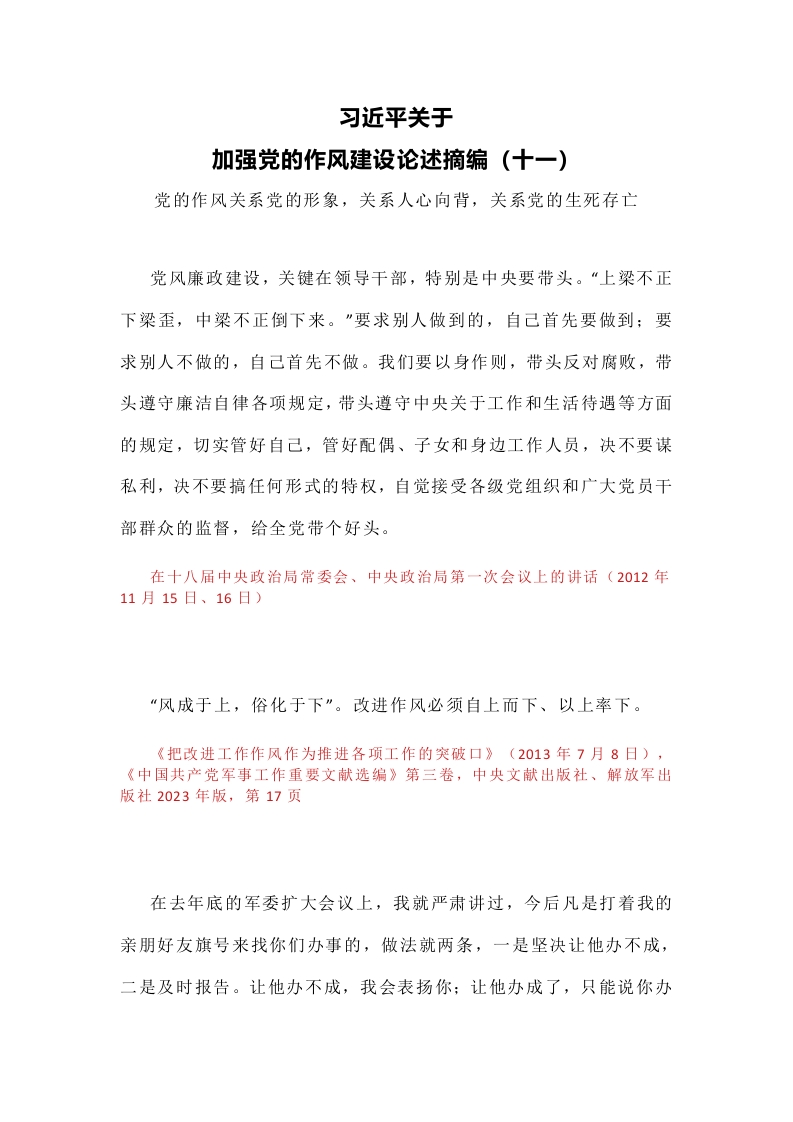 习近平关于加强党的作风建设论述摘编(十一)党的作风关系党的形象,关系人心向背,关系党的生死存亡党风廉政建设,关键在领导干部,特别是中央要带头。“上梁不正下梁歪,中梁不正倒下来。”要求别人做到的,自己首先要做到:要求别人不做的,自己首先不做。我们要以身作则,带头反对腐败,带头遵守廉洁自律各项规定,带头遵守中央关于工作和生活待遇等方面的规定,切实管好自己,管好配偶、子女和身边工作人员,决不要谋私利,决不要搞任何形式的特权,自觉接受各级党组织和广大党员干部群众的监督,给全党带个好头。在十八届中央政治局常委会、中央政治局第一次会议上的讲话(2012年11月15日、16日)“风成于上,俗化于下”。改进作风必须自上而下、以上率下。《把改进工作作风作为推进各项工作的突破口》(2013年7月8日),《中国共产党军事工作重要文献选编》第三卷,中央文献出版社、解放军出版社2023年版,第17页在去年底的军委扩大会议上,我就严肃讲过,今后凡是打着我的亲朋好友旗号来找你们办事的,做法就两条,一是坚决让他办不成,二是及时报告。让他办不成,我会表扬你:让他办成了,只能说你办了一件坏事,办了一件给我抹黑的事。我这样说绝不是摆摆姿态的,而且一直是这么做的。现在,我重申这个态度,希望大家也这样做。我们是共产党人,决不能搞“一人得道、鸡犬升天”那一套。《把改进工作作风作为推进各项工作的突破口》(2013年7月8日),《中国共产党军事工作重要文献选编》第三卷,中央文献出版社、解放军出版社2023年版,第17页凡事都是这样的,上行下效,上率下行,上有所好、下必甚焉,上有所恶、下必不为,上面松一寸、下面松一尺。所以,坚持“两个务必”要从领导干部做起,领导干部要以身作则。《中国革命历史是最好的营养剂》(2013年7月11日、12日),习近平《论党的自我革命》,中央文献出版社、党建读物出版社、中国方正出版社2023年版,第70-71页领导干部带头,应该是具体的而不是抽象的、全面的而不是有选择的、一以贯之的而不是虎头蛇尾的。我们强调领导干部要认识高一层、学习深一步、实践先一着,每一条都要看得见、摸得着。《在河北调研指导党的群众路线教有实践话动时的讲话》(2013年7月11日、12日)做领导工作本来就是“苦差事”,很多时候要“五加二”、“白加黑”,想舒舒服服的就不要当领导干部。即便有了一点空闲时间,陪伴家人、