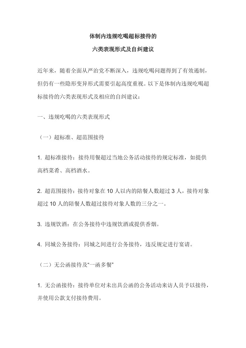 体制内违规吃喝超标接待的六类表现形式及自纠建议近年来,随着全面从严治党不断深入,违规吃喝问题得到了有效遏制,但仍有一些隐形变异形式需要引起高度重视。以下是体制内违规吃喝超标接待的六类表现形式及相应的自纠建议:一、违规吃喝的六类表现形式(一)超标准、超范围接待1.超标准接待:接待用餐超过当地公务活动接待的规定标准,如提供高档菜肴、高档酒水。2.超范围接待:接待对象在10人以内的陪餐人数超过3人,接待对象超过10人的陪餐人数超过接待对象人数的三分之一。3.违规饮酒:在公务接待中违规饮酒或提供香烟。4.同城公务接待:同城之间进行公务接待,违反规定进行宴请。(二)无公函接待及“一函多餐”1.无公函接待:接待单位对未出具公函的公务活动来访人员予以接待,并使用公款支付接待费用。2.“一函多餐”:同一接待单位对出具一份公函的公务活动来访人员,安排多次工作餐。3.伪造公函:通过弄虚作假、虚构接待事项、虚增接待人数等方式,违规吃喝或报销。(三)违规接受管理服务对象宴请1.接受私营企业主宴请:接受管理和服务对象的宴请,尤其是接受私营企业主或下属单位的宴请。2.接受特定关系人宴请:接受管理服务对象及其特定关系人、直接管理的下属单位和个人的宴请。(四)利用接待之机大吃大喝1.内部食堂违规接待:在单位内部食堂大吃大喝,超标准安排工作餐。2.豪华场所接待:在高消费餐饮场所进行接待。3.违规提供高档菜肴:在公务接待中提供高档菜肴、野生保护动物制作的菜肴。(五)违规报销吃喝费用