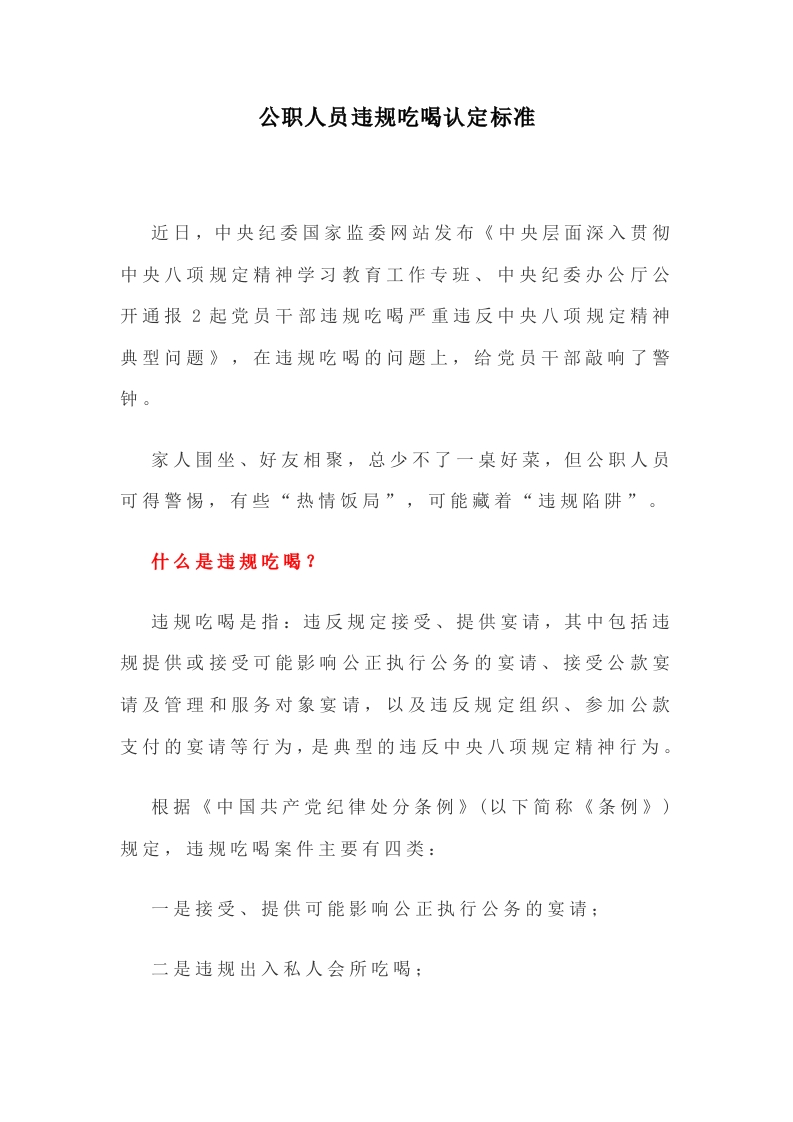 公职人员违规吃喝认定标准近日,中央纪委国家监委网站发布《中央层面深入贯彻中央八项规定精神学习教育工作专班、中央纪委办公厅公开通报2起党员干部违规吃喝严重违反中央八项规定精神典型问题》,在违规吃喝的问题上,给党员干部敲响了警钟。家人围坐、好友相聚,总少不了一桌好菜,但公职人员可得警惕,有些“热情饭局”,可能藏着“违规陷阱”。什么是违规吃喝?违规吃喝是指:违反规定接受、提供宴请,其中包括违规提供或接受可能影响公正执行公务的宴请、接受公款宴请及管理和服务对象宴请,以及违反规定组织、参加公款支付的宴请等行为,是典型的违反中央八项规定精神行为。根据《中国共产党纪律处分条例》(以下简称《条例》)规定,违规吃喝案件主要有四类:一是接受、提供可能影响公正执行公务的宴请:二是违规出入私人会所吃喝:三是违规组织、参加用公款支付的宴请:四是超标准、超范围接待或者借机大吃大喝。认定违规吃喝的关键是什么?根据违规吃喝问题的构成要素,认定违规吃喝的关键点在于弄清参与吃喝的人员关系、吃喝的地点性质和吃喝的钱款来源,也就是和谁吃、在哪儿吃、谁付钱。和谁吃党员干部也有生活,也需要维系感情,不是说和谁吃饭都不行,如果是和家里人、亲朋好友的正常聚餐,那么没有任何问题。不过,根据《条例》第一百零一条规定,无论吃饭花费的是否为公款,只要是可能影响公正执行公务的宴请,党员干部一概不能接受。下属、下级单位、企业、管理和服务对象,带有这些词条属性的人,不管是什么原因,不管在哪儿吃,只要是对方宴请,吃了就是违纪。在哪儿吃