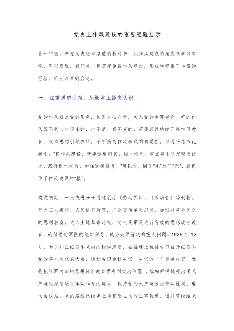 党史上作风建设的重要经验启示翻开中国共产党历史这本厚重的教科书,从作风建设的角度来学习审视,可以发现,我们党一贯高度重视作风建设,形成和积累了丰富的经验,给人以深刻启迪。一、注重思想引领,从根本上提高认识党的作风就是党的形象,关系人心向背,关系党的生死存亡。好的作风既不是与生俱来的,也不是一成不变的,需要通过持续开展学习教育,发挥思想引领作用,不断提高作风养成的自觉性。习近平总书记指出:“抓作风建设,就要返璞归真、固本培元,重点突出坚定理想信念、践行根本宗旨、加强道德修养。”可以说,固了“本”培了“元”,就抓住了作风建设的“根”。建党初期,一批先进分子通过创办《劳动界》、《劳动音》等刊物,开办工人夜校、农民讲习所等,广泛宣传革命思想,加强对革命民众的思想教育。进入土地革命时期,对人民军队进行有效的思想政治教育,确保党对军队的绝对领导,成为必须解决的重大问题。1929年12月,为了纠正红四军党内的错误思想,在福建上杭县古田召开红四军党的第九次代表大会,通过古田会议决议。决议的一个重要内容,就是把红军内部的思想政治教育提高到突出位置,旗帜鲜明地提出用无产阶级思想进行军队和党的建设,保持党的无产阶级先锋队性质。遵义会议后,党的路线已经走上马克思主义的正确轨道,但对曾经给党的事业造成严重危害的主观主义、教条主义还没有来得及从思想上进行认真的清理,有必要集中开展一场普遍的马克思主义思想教育运动。延安整风运动从加强马克思主义理论学习教育入手,提高党员思想认识,在此基础上开展批评和自我批评,推动实现学风、党风、文风的好转。新中国成立后,全党全军开展整风运动,接着又在党政机关工作人员中开展反对贪污、反对浪费、反对官僚主义的斗争,推动了作风建设深入发展。改革开放以后,通过全面整党和开展一系列集中性教育活动,引导党员、干部坚定理想信念,加强党性修养,勇于解决党内存在的思想不纯、政治不纯、组织不纯、作风不纯等突出问题。党的十八大以来,我们党持续开展一系列党内集中性学习教育,根据形势和任务的不同各有侧重,始终贯穿加强党的作风建设的鲜明要求,对党的作风建设产生深远的影响。回顾百余年来党的作风建设实践,可以看出思想教育是加强作风建设的重要法宝,是改进作风的有效途径。应坚持集中教育与日常教育相结合,通过集中教育主要解决倾向性的作风问题,通过日常教育不断提醒,时刻绷紧思想作风之弦。通过持续深化党的思想理论武装,不断提高对作风建设的认识。创新教育方式方法和手段载体,采取多种形式特别是运用由风及腐案例加强警示教育,引导党员、干部锤炼党性、提高思想觉悟,以优良党风带动社风民风向上向善。