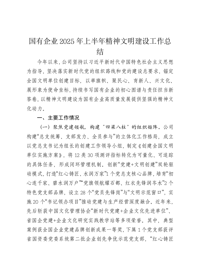 国有企业2025年上半年精神文明建设工作总结今年以来,公司坚持以习近平新时代中国特色社会主义思想为指导,坚决落实新时代党的组织路线和党的建设总要求,锚定全国文明单位创建目标,以举旗帜、聚民心、育新人、兴文化、展形象为使命坐标,持续书写国有企业的初心图谱与责任担当新答卷,以精神文明建设为国有企业高质量发展提供坚强的精神文化动力。一、主要工作情况(一)聚焦党建领航,构建“四梁八柱”的组织矩阵。公司构建“总支统筹、支部发力、全员参与”的立体化工作格局,成立以党总支书记为组长的创建工作领导小组,制定《创建全国文明单位实施方案》,将12类30项测评指标转化为可量化、可追踪的具体任务,形成闭环管理机制。创新“党建+文明创建”双轮驱动模式,打造“红心铸匠、水润万家”1个党总支核心品牌,培育“初心连千家、碧水润万户“党旗领航耀石都、红衣先锋润岑水”2个特色党支部品牌,设立28个“党员先锋岗”与“文明示范窗口”,实施20个“书记领办项目”推动党建与生产经营深度融合。近年来,先后斩获中国文化管理协会“新时代党建+企业文化先进单位”、省国企党建+企业文化研究实践教学站等多项荣誉。其中,典型案例获全国企业党建品牌创新成果一等奖,下属1个党支部获评省国资委党委系统第二批企业创先争优示范党支部,“红心铸匠水润万家”党建品牌入选岑溪市“十佳党建工作品牌”,构建起坚强的政治引领体系。(二)聚焦文化铸魂,培育“五水文化”的精神沃土。以社会主义核心价值观为引领,提炼形成具有行业特色的“五水”文化体系一“水到渠成”的思想文化、“水滴石穿”的敬业文化、“水清如镜”的廉洁文化、“水润万物”的奉献文化、“水乳交融”的和谐文化。建成“文明实践所“国企书院“道德模范工作室“清廉国企室”等6大文化阵地,培育出全国道德模范和全国敬老爱老助老模范、省国资国企勤廉榜样等先进典型,通过“传帮带”“师带徒”机制培养26名中青年技术骨干,形成“树立一个、带动一片”的示范效应。以“我们的节日”为载体,累计举办红色故事会、水周宣传、经典诵读等主题活动68场次,参与职工达1200余人次。将公司140名志愿者组成5支不同类型的志愿服务队,常态化开展“供水服务进社区“礼让斑马线节水护水”等11项志愿服务,累计服务时长21500小时,获评市新时代文明实践志愿服务工作先进单位、市最佳志愿服务组织。(三)聚焦责任担当,彰显“水润石都”的国企力量。以“城区发展到哪里,供水管网就延伸到哪里”为建设理念,累计投入国债资金5000万元、自有资金4000万元,实施第一水厂5万吨/日扩建工程,新建改造供水管网62公里,供水压力从2.5公斤提升至4公斤,服务覆盖人口突破30万,满足未来10年城市发展用水需求,城区管网普及率98%以上,供水可靠率达99.3%。
