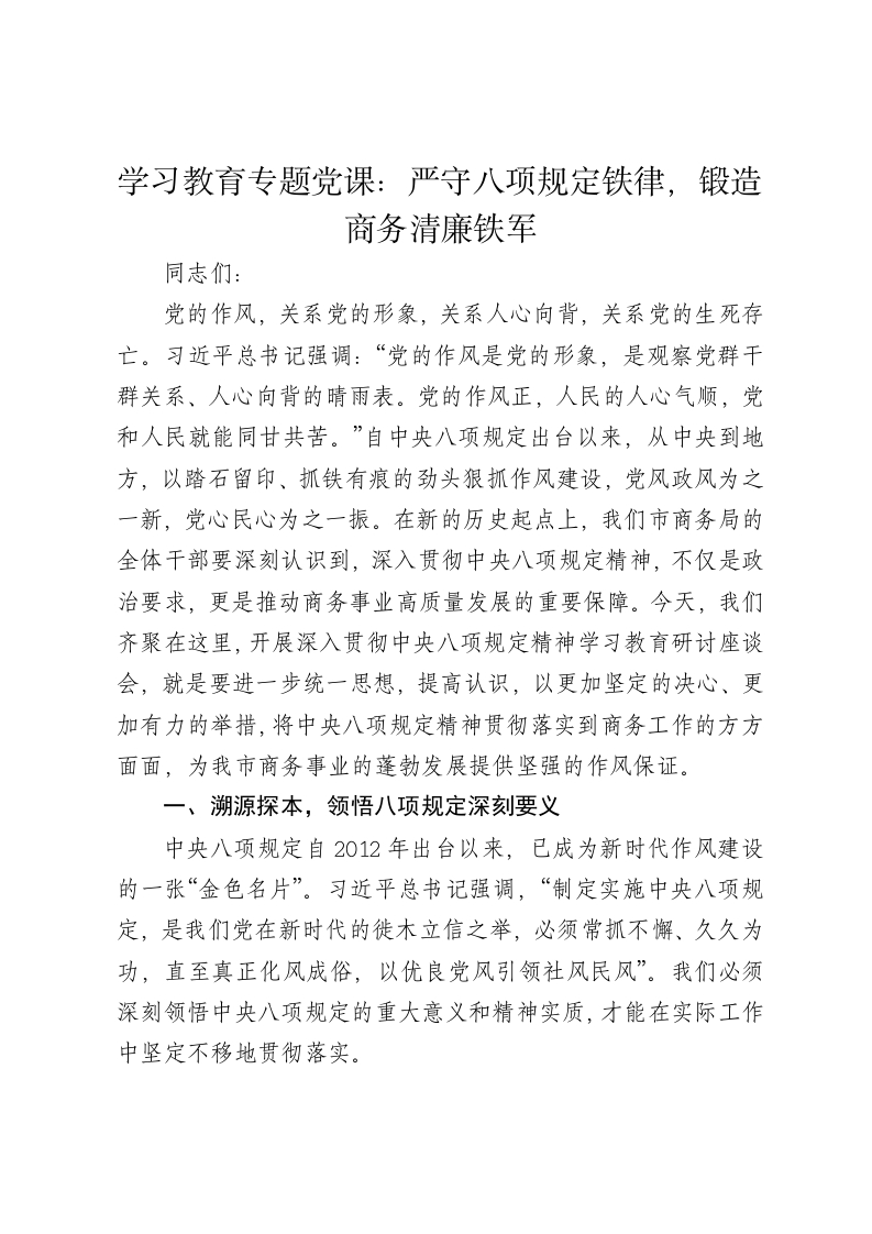 学习教育专题党课:严守八项规定铁律,锻造商务清廉铁军同志们:党的作风,关系党的形象,关系人心向背,关系党的生死存亡。习近平总书记强调:“党的作风是党的形象,是观察党群干群关系、人心向背的晴雨表。党的作风正,人民的人心气顺,党和人民就能同甘共苦。”自中央八项规定出台以来,从中央到地方,以踏石留印、抓铁有痕的劲头狠抓作风建设,党风政风为之一新,党心民心为之一振。在新的历史起点上,我们市商务局的全体干部要深刻认识到,深入贯彻中央八项规定精神,不仅是政治要求,更是推动商务事业高质量发展的重要保障。今天,我们齐聚在这里,开展深入贯彻中央八项规定精神学习教育研讨座谈会,就是要进一步统一思想,提高认识,以更加坚定的决心、更加有力的举措,将中央八项规定精神贯彻落实到商务工作的方方面面,为我市商务事业的蓬勃发展提供坚强的作风保证。一、溯源探本,领悟八项规定深刻要义中央八项规定自2012年出台以来,已成为新时代作风建设的一张“金色名片”。习近平总书记强调,“制定实施中央八项规定,是我们党在新时代的徙木立信之举,必须常抓不懈、久久为功,直至真正化风成俗,以优良党风引领社风民风”。我们必须深刻领悟中央八项规定的重大意义和精神实质,才能在实际工作中坚定不移地贯彻落实。(一)八项规定是从严治党的重要开端。党的十八大以来,以习近平同志为核心的党中央以“得罪千百人、不负十四亿”的使命担当祛疴治乱,开展了史无前例的反腐败斗争,不敢腐、不能腐、不想腐一体推进,“打虎”“拍蝇”“猎狐”多管齐下,反腐败斗争取得压倒性胜利并全面巩固,消除了党、国家、军队内部存在的严重隐患,确保党和人民赋予的权力始终用来为人民谋幸福。中央八项规定作为全面从严治党的开篇之作,从改进调查研究、精简会议活动等具体问题入手,以小见大、以点带面,向全党全社会释放出强烈信号:党要管党、从严治党不是一句空话,作风建设永远在路上。这八项规定,看似是对工作中的一些小事小节作出规定,实则蕴含着大战略、大考量。它抓住了作风建设的“牛鼻子”,以作风建设为突破口,推动全面从严治党向纵深发展。我们市商务局作为经济发展的重要部门,肩负着推动全市商贸流通、对外贸易、招商引资等重要职责,必须从讲政治的高度,深刻认识到贯彻落实中央八项规定精神是我们履行职责使命的基本前提,是保持党的先进性和纯洁性的必然要求。只有我们自身作风过硬,才能在服务企业、推动发展中赢得信任和支持,才能更好地发挥商务部门在经济建设中的重要作用。(二)八项规定是密切联系群众的务实之举。习近平总书记指出,“我们党来自人民、植根人民、服务人民,一旦脱离群众,就会失去生命力。”中央八项规定的每一条内容,都聚焦于解决群众反映强烈的突出问题,体现了我们党全心全意为人民服务的