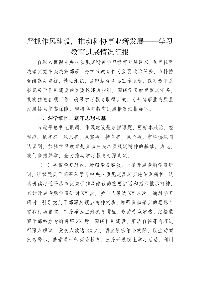 严抓作风建设,推动科协事业新发展一学习教育进展情况汇报自深入贯彻中央八项规定精神学习教育开展以来,我单位坚决落实党中央决策部署,将学习教育作为重要政治任务。市科协党组高度重视,精心组织,紧密结合科协工作职责,以习近平总书记关于作风建设的重要论述为指引,围绕学习教育重点任务,扎实推进各项工作,确保学习教育取得实效,为科协事业高质量发展提供坚实保障。现将学习教育进展情况汇报如下。一、深学细悟,筑牢思想根基习近平总书记强调,作风建设是永恒课题,要标本兼治,经常抓、见常态,深入抓、见实效,持久抓、见长效。市科协深刻认识到,加强学习教育是贯彻中央八项规定精神的基础。为此,我们多措并举,全力推动学习教育走深走实。(一)丰富学习形式,增强学习实效。一是开展专题学习研讨。组织党员干部深入学习中央八项规定及其实施细则精神,认真研读习近平总书记关于作风建设的重要讲话和指示批示精神,累计开展专题学习研讨X次,参与人数达X人次。通过学习研讨,引导党员干部深刻领会精神实质,增强贯彻落实的思想自觉和行动自觉。二是举办主题教育讲座。邀请专家学者、纪检监察干部举办专题讲座XX场,围绕作风建设、廉洁自律等内容进行深入解读,受众人数达XX人。讲座紧密结合实际,以生动案例为警示,使党员干部深受教育。三是开展线上学习活动。利用“学习强国”、科协官网、微信公众号等平台,推送学习资料XX篇,组织线上知识测试X次,参与测试人数达X人次,有效提升了学习的覆盖面和便捷性。(二)强化宣传引导,营造良好氛围。一是在科协办公场所设置宣传展板X块,悬挂横幅X条,张贴标语X张,广泛宣传中央八项规定精神和学习教育的重要意义,使之家喻户晓、深入人心。二是在科协官网、微信公众号开设学习教育专栏,及时发布学习教育动态、工作成效、先进典型等信息XX条,营造了浓厚的学习氛围。三是编印学习教育简报X期,向上级部门和有关单位报送工作进展情况,展示科协学习教育成果,得到了上级部门的充分肯定。(三)抓好教育培训,提升干部素质。一是将中央八项规定精神纳入干部教育培训计划,举办专题培训班X期,培训干部X人次,通过系统学习,进一步提高了干部的政治素质和业务能力。二是开展廉政教育活动,组织党员干部参观廉政教育基地X次,观看警示教育片X部,教育引导党员干部知敬畏、存戒惧、守底线。三是加强作风建设培训,邀请党校专家、业务骨干进行授课,就如何改进工作作风、提高工作效率等内容进行培训,累计培训X人次,有效提升了干部的作风建设水平。二、自查自纠,整治突出问题习近平总书记指出,要聚焦突出问题,自觉对标对表,加强党性修养,筑牢思想根基。市科协坚持问题导向,深入开展自查