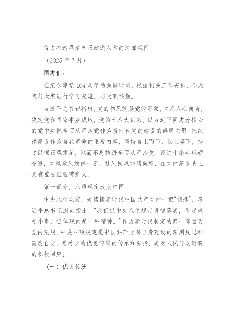 奋力打造风清气正政通人和的清廉氛围(2025年7月)同志们:在纪念建党104周年的关键时刻,根据相关工作安排,今天我与大家进行学习交流,与大家共勉。习近平总书记指出,党的作风就是党的形象,关系人心向背,决定党和国家事业成败。党的十八大以来,以习近平同志为核心的党中央把全面从严治党作为新时代党的建设的鲜明主题,把纪律建设作为自我革命的重要内容,坚持自上而下、以上率下,持之以恒正风肃纪,驰而不息推进全面从严治党,经过十余年砥砺奋进,党风政风焕然一新,社风民风持续向好,在党的建设史上具有重要里程碑意义。第一部分,八项规定改变中国中央八项规定,是读懂新时代中国共产党的一把“钥匙”。习近平总书记深刻指出:“我们抓中央八项规定贯彻落实,看起来是小事,但体现的是一种精神。”作为新时代制定的第一部重要党内法规,中央八项规定是中国共产党对自身建设的深刻反思和高度自觉,是对党的优良传统的传承和弘扬,是对人民群众期盼的积极回应。(一)优良传统中国共产党团结带领人民取得革命、建设、改革的伟大成就,很重要的一条原因就是党在长期实践中培育并坚持了一整套光荣传统和优良作风。从井冈山上的“三大纪律、六项注意”,到中共苏区传唱的“日着草鞋干革命,夜打灯笼访贫农”;从毛泽东的“一根灯芯”到“朱德的扁担”;从老一辈革命家住窑洞、吃粗粮、穿布衣的“延安作风”,到西柏坡立下“一不做寿,二不送礼”等规矩…一个个生动的历史细节,无不体现了中国共产党的光荣传统和优良作风。(二)发展历程1.2012年:开局破题,定下基调出台背景:中国共产党自成立以来,始终注重作风建设,从“三大纪律八项注意”到“三大作风”,再到“两个务必”,党的作风建设贯穿于党的发展历程之中。新时期以来,由于一系列客观原因和自身思想的松懈,少数党员、干部党性意识日益淡薄、群众观念日益模糊、艰苦奋斗作风逐步丧失,这些行为违反了党的纪律,严重损害了党和政府的形象,必须坚决予以治理。党中央为切实改进工作作风、密切联系群众,决定出台此规定。规定内容:2012年12月4日,中央政治局审议通过了《中央政治局关于改进工作作风、密切联系群众的八项规定》,从调查研究、会议活动等8个方面为加强作风建设立下规矩。2.2013-2016年:落实精神,持续发力