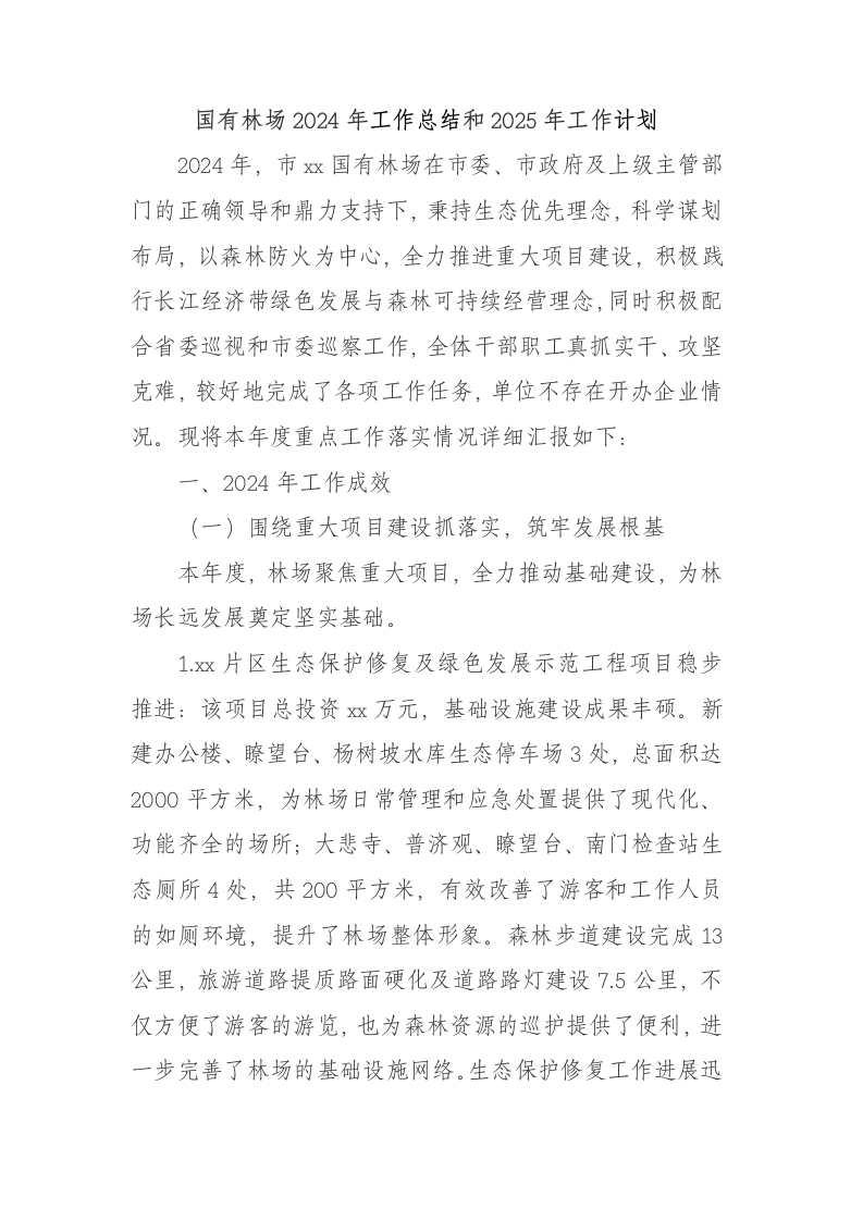 国有林场2024年工作总结和2025年工作计划2024年,市x国有林场在市委、市政府及上级主管部门的正确领导和鼎力支持下,秉持生态优先理念,科学谋划布局,以森林防火为中心,全力推进重大项目建设,积极践行长江经济带绿色发展与森林可持续经营理念,同时积极配合省委巡视和市委巡察工作,全体干部职工真抓实干、攻坚克难,较好地完成了各项工作任务,单位不存在开办企业情况。现将本年度重点工作落实情况详细汇报如下:一、2024年工作成效(一)围绕重大项目建设抓落实,筑牢发展根基本年度,林场聚焦重大项目,全力推动基础建设,为林场长远发展奠定坚实基础。1.x燃片区生态保护修复及绿色发展示范工程项目稳步推进:该项目总投资x万元,基础设施建设成果丰硕。新建办公楼、瞭望台、杨树坡水库生态停车场3处,总面积达2000平方米,为林场日常管理和应急处置提供了现代化、功能齐全的场所;大悲寺、普济观、瞭望台、南门检查站生态厕所4处,共200平方米,有效改善了游客和工作人员的如厕环境,提升了林场整体形象。森林步道建设完成13公里,旅游道路提质路面硬化及道路路灯建设7.5公里,不仅方便了游客的游览,也为森林资源的巡护提供了便利,进一步完善了林场的基础设施网络。生态保护修复工作进展迅速,成果显著。完成森林生态提质270公顷,通过科学的森林抚育和补植补造措施,优化了森林结构,提高了森林生态系统的稳定性和生态服务功能;人工湿地修复6公顷,为湿地生物提供了良好的栖息环境,增强了湿地的生态调节能力;植物群落恢复77公顷,促进了生物多样性的恢复和保护;水库清淤及堤坝灌浆处理1.5万立方米,有效提升了水库的蓄水能力和防洪安全,保障了周边生态系统的水源供应。2.其他相关项目高效完成:双南门旅游公路服务区、瞭望台改造、消防主题科普公园、消防水池、步道等项目总投资x万元,项目全部竣工验收并完成结算。这些项目的实施,进一步完善了林场的旅游服务设施和森林防火基础设施,提升了林场的综合承载能力和应急处置能力,为林场的可持续发展提供了有力支撑。(二)聚力生态提质增效抓落实,厚植生态底色林场始终将生态提质增效作为核心任务,多措并举,全力提升森林生态系统的质量和效益。1.积极开展生态修复与植被恢复工作:投入50多万元,清理雨雪冰冻灾害损坏的竹木,及时消除了灾害对森林生态系统的破坏,恢复了森林的生态完整性。投入15万元在生物防火林带栽植木荷50000余株,构建了有效的生物防火隔离带,降低了森林火灾的风险;投入15万元,补植补造栾树5500余株、朴树1000余株、鸡爪槭500株、南酸枣