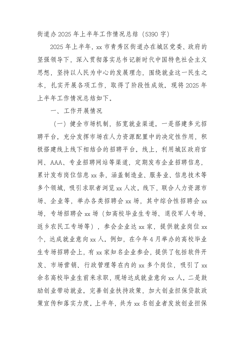 街道办2025年上半年工作情况总结(5390字)2025年上半年,xx市青秀区街道办在城区党委、政府的坚强领导下,深入贯彻落实总书记新时代中国特色社会主义思想,坚持以人民为中心的发展理念,围绕就业这一民生之本,扎实开展各项工作,取得了阶段性成效。现将2025年上半年工作情况总结如下。一、工作开展情况(一)健全市场机制,拓宽就业渠道。一是搭建多元招聘平台。充分发挥市场在人力资源配置中的决定性作用,积极搭建线上线下相结合的招聘平台。线上,利用城区政府官网、AAA、专业招聘网站等渠道,定期发布企业招聘信息,累计发布岗位信息燃条,涵盖制造业、服务业、信息技术等多个领域,吸引求职者浏览x人次。线下,联合人力资源市场、企业等,举办各类招聘会燃场,其中综合性招聘会燃场,专场招聘会场(如高校毕业生专场、退役军人专场、返乡农民工专场等),参会企业达双家,提供就业岗位个,达成就业意向x人。例如,在今年4月举办的高校毕业生专场招聘会上,有双家知名企业参会,提供了包括软件开发、市场营销、行政管理等在内的x多个岗位,吸引了燃余名高校毕业生前来求职,现场达成就业意向人。二是鼓励创业带动就业。完善创业扶持政策,加大创业担保贷款政策宣传和落实力度。上半年,共为双名创业者发放创业担保贷款双万元,有效缓解了创业者的资金压力。同时,加强创业孵化基地建设,目前已建成x个创业孵化基地,入驻创业实体x家,带动就业双人。积极开展创业培训,组织创业培训课程x期,培训创业者双人次,提升了创业者的创业能力和水平。三是加强劳务协作对接。积极与周边地区及劳务输出大省开展劳务协作,建立劳务合作关系。通过与外地人社部门、劳务中介机构沟通协调,及时掌握外地企业用工需求,组织辖区劳动力外出就业。上半年,共向外地输送劳动力x人,其中向长三角地区输送双人,向珠三角地区输送燃人。同时,积极引进外地优质劳动力资源,满足本地企业用工需求,为辖区经济发展提供人力资源支持。(二)推动产业发展,提高就业质量。一是助力产业升级转型。积极配合城区政府推进产业结构调整和升级转型,围绕双市重点发展的产业方向,如新能源汽车、电子信息、生物医药等,加大对相关企业的扶持力度。通过提供政策咨询、项目申报指导等服务,帮助企业解决发展过程中遇到的问题,促进企业做大做强。随着产业的升级发展,企业对高素质、高技能人才的需求不断增加,为辖区居民提供了更多高质量的就业岗位。二是促进产教融合发展。加强与辖区内高校、职业院校的合作,推动产教融合发展。建立校企合作对接机制,组织企业与院校开展人才培养、实习实训、技术研发等方面的合作。上半年,共促成双家企业与x所院校