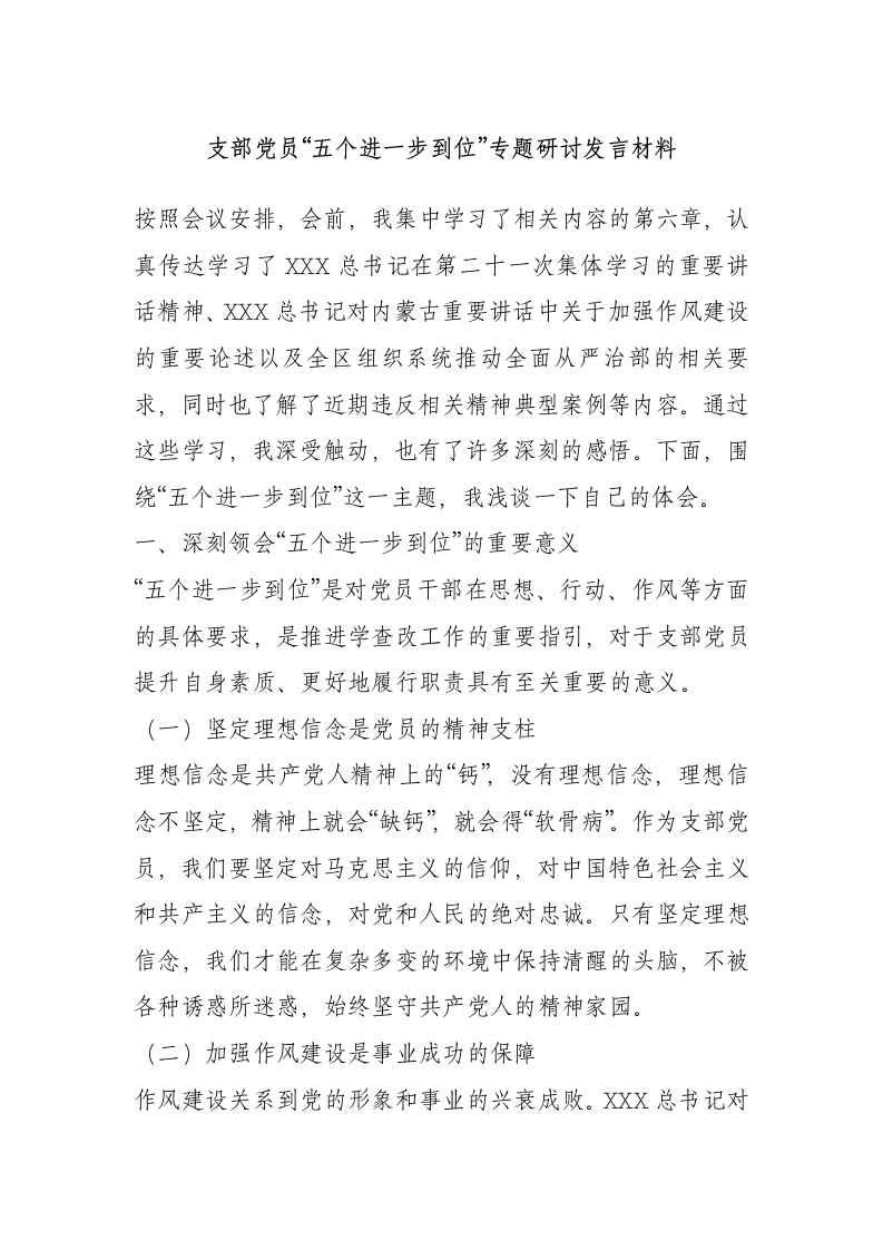 支部党员“五个进一步到位”专题研讨发言材料按照会议安排,会前,我集中学习了相关内容的第六章,认真传达学习了XXX总书记在第二十一次集体学习的重要讲话精神、XX总书记对内蒙古重要讲话中关于加强作风建设的重要论述以及全区组织系统推动全面从严治部的相关要求,同时也了解了近期违反相关精神典型案例等内容。通过这些学习,我深受触动,也有了许多深刻的感悟。下面,围绕“五个进一步到位”这一主题,我浅谈一下自己的体会。一、深刻领会“五个进一步到位”的重要意义“五个进一步到位”是对党员干部在思想、行动、作风等方面的具体要求,是推进学查改工作的重要指引,对于支部党员提升自身素质、更好地履行职责具有至关重要的意义。(一)坚定理想信念是党员的精神支柱理想信念是共产党人精神上的“钙,没有理想信念,理想信念不坚定,精神上就会“缺钙”就会得“软骨病”作为支部党员,我们要坚定对马克思主义的信仰,对中国特色社会主义和共产主义的信念,对党和人民的绝对忠诚。只有坚定理想信念,我们才能在复杂多变的环境中保持清醒的头脑,不被各种诱惑所迷惑,始终坚守共产党人的精神家园。(二)加强作风建设是事业成功的保障作风建设关系到党的形象和事业的兴衰成败。XX总书记对内蒙古重要讲话中关于加强作风建设的重要论述,为我们指明了方向。我们要以这些论述为指导,进一步加强自身作风建设,坚决反对形式主义、官僚主义、享乐主义和奢靡之风。在工作中,要脚踏实地、真抓实干,勇于担当、积极作为,以良好的作风推动各项工作的顺利开展。(三)推进学查改是提升自我的有效途径“五个进一步到位”要求我们持续推进学查改,通过不断学习提高自身的理论水平和业务能力,通过深入查摆发现自身存在的问题和不足,通过认真整改加以改进和完善。这是一个不断自我提升、自我完善的过程,能够使我们更好地适应新时代的要求,更好地为党和人民的事业贡献力量。二、以“五个进一步到位”持续推进学查改(一)进一步坚定理想信念,铸牢对党忠诚加强理论学习要深入学习XX新时代中国特色社会主义思想,学习党的二十大精神,不断提高政治理论水平。通过学习,深刻领会党的理论和路线方针政策,增强对党的认同感和归属感,坚定对党的忠诚。强化党性修养要时刻牢记自己的党员身份,自觉遵守党的纪律和规矩,严格要求自己。在工作和生活中,要始终保持共产党人的先进性和纯洁性,做到言行一致、表里如一。践行党的宗旨