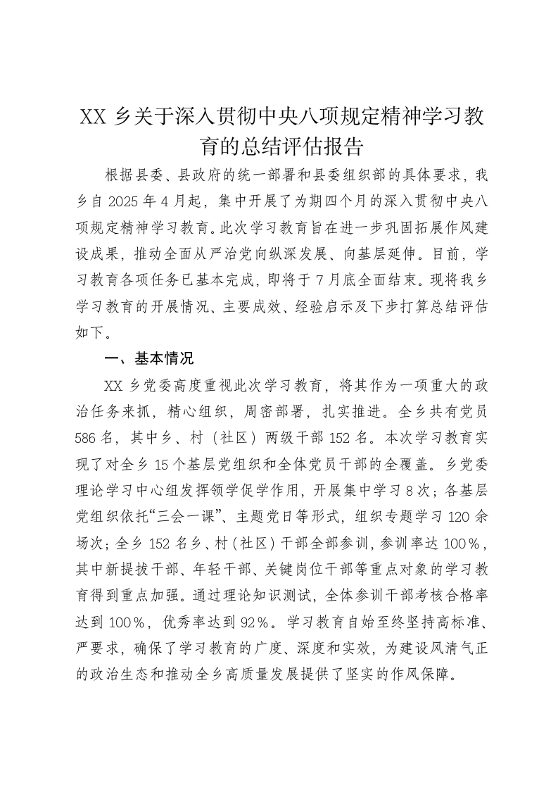 XX乡关于深入贯彻中央八项规定精神学习教育的总结评估报告根据县委、县政府的统一部署和县委组织部的具体要求,我乡自2025年4月起,集中开展了为期四个月的深入贯彻中央八项规定精神学习教育。此次学习教育旨在进一步巩固拓展作风建设成果,推动全面从严治党向纵深发展、向基层延伸。目前,学习教育各项任务已基本完成,即将于7月底全面结束。现将我乡学习教育的开展情况、主要成效、经验启示及下步打算总结评估如下。一、基本情况X乡党委高度重视此次学习教育,将其作为一项重大的政治任务来抓,精心组织,周密部署,扎实推进。全乡共有党员586名,其中乡、村(社区)两级千部152名。本次学习教育实现了对全乡15个基层党组织和全体党员干部的全覆盖。乡党委理论学习中心组发挥领学促学作用,开展集中学习8次;各基层党组织依托“三会一课”、主题党日等形式,组织专题学习120余场次;全乡152名乡、村(社区)千部全部参训,参训率达100%,其中新提拔干部、年轻干部、关键岗位干部等重点对象的学习教育得到重点加强。通过理论知识测试,全体参训干部考核合格率达到100%,优秀率达到92%。学习教育自始至终坚持高标准、严要求,确保了学习教育的广度、深度和实效,为建设风清气正的政治生态和推动全乡高质量发展提供了坚实的作风保障。二、主要做法乡党委紧扣“学、查、改、治、评”五个关键环节,坚持统筹推进、分类指导、标本兼治,确保学习教育不虚、不空、不偏、不走过场。(一)强化组织领导,高位推动压实责任乡党委深刻认识到,作风建设的成败,关键在于责任是否落实到位。为此,我们始终将责任扛在肩上、抓在手上。一是迅速成立领导小组。学习教育启动伊始,乡党委第一时间成立了由乡党委书记任组长,乡长、副书记任副组长,其他班子成员为组员的“X乡深入贯彻中央八项规定精神学习教育领导小组”,下设办公室于乡党建办,负责日常工作的统筹协调和督促检查,形成了“一把手”负总责、分管领导具体抓、班子成员“一岗双责”、各部门协同推进的领导体制和工作格局。二是精心制定实施方案。结合我乡实际,研究制定了《XX乡关于深入贯彻中央八项规定精神学习教育实施方案》,明确了学习教育的指导思想、目标任务、方法步骤和具体要求,绘制了“时间表”和“路线图”,使全乡各级党组织和党员干部开展工作有章可循、有据可依。三是层层压实工作责任。于4月初召开全乡动员部署大会,乡党委书记作动员讲话,全面阐明学习教育的重大意义,并与各村(社区)党组织书记、乡直各单位负责人签订了《作风建设责任书》,将责任逐级传导、压力层层压实,确保了学习教育在基层一线不打折扣、全面落实。