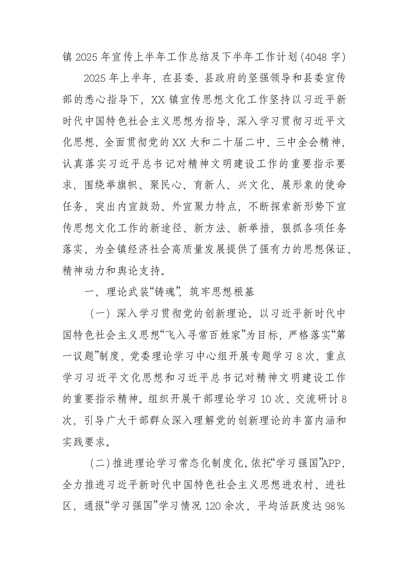 镇2025年宣传上半年工作总结及下半年工作计划(4048字)2025年上半年,在县委、县政府的坚强领导和县委宣传部的悉心指导下,X镇宣传思想文化工作坚持以习近平新时代中国特色社会主义思想为指导,深入学习贯彻习近平文化思想,全面贯彻党的X大和二十届二中、三中全会精神,认真落实习近平总书记对精神文明建设工作的重要指示要求,围绕举旗帜、聚民心、育新人、兴文化、展形象的使命任务,突出内宣鼓劲、外宣聚力特点,不断探索新形势下宣传思想文化工作的新途径、新方法、新举措,狠抓各项任务落实,为全镇经济社会高质量发展提供了强有力的思想保证、精神动力和舆论支持。一、理论武装“铸魂”筑牢思想根基(一)深入学习贯彻党的创新理论。以习近平新时代中国特色社会主义思想“飞入寻常百姓家”为目标,严格落实“第一议题”制度,党委理论学习中心组开展专题学习8次,重点学习习近平文化思想和习近平总书记对精神文明建设工作的重要指示精神。组织开展干部理论学习10次、交流研讨8次,引导广大干部群众深入理解党的创新理论的丰富内涵和实践要求。(二)推进理论学习常态化制度化。依托“学习强国”APP,全力推进习近平新时代中国特色社会主义思想进农村、进社区,通报“学习强国”学习情况120余次,平均活跃度达98%以上。建立理论学习积分制度,激发党员干部学习积极性。开展“理论微宣讲”活动15场次,让党的创新理论更好地走进基层、走进群众。(三)深入推动学习教育。扎实开展深入贯彻中央八项规定精神学习教育,组织各类宣讲12场次,进行专题研讨500余人次,组织交流发言25人次,领导干部撰写心得体会30余篇。开展“传承红色基因、赓续红色血脉”主题教育活动,不断强化党员干部爱国主义、集体主义、社会主义教育,深化中国特色社会主义和中国梦宣传教育。二、意识形态“强基”增强发展凝聚力(一)压实意识形态工作责任。坚持“党管意识形态”基本原则,把意识形态工作摆在全局和战略位置,严格落实党委主体责任,党委书记履行第一责任人职责、班子成员严格执行“一岗双责”将意识形态工作同全镇各项工作同部署、同落实、同检查、同考核。上半年专题研究部署意识形态工作8次,组织召开意识形态工作专题培训班2次,将意识形态工作纳入年度目标管理和绩效考核体系。(二)强化意识形态阵地管理。定期对各村(社区)意识形态工作进行督查,确保意识形态工作落实落细。整合各类宣传文化阵地和资源,充分发挥镇、村文化大舞台、文化广场、新时代文明实践所(站)等阵地作用,持续开展文艺演出、理论宣讲、公益活动等。依托社科普及教育基地,开