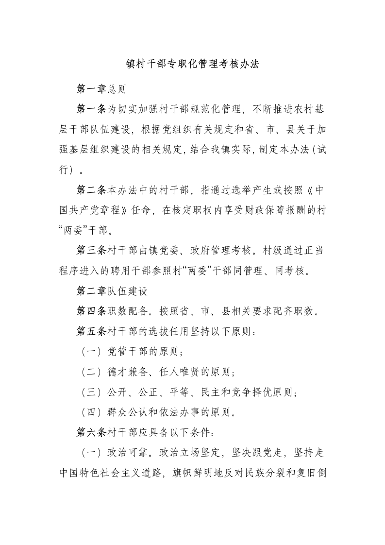 镇村干部专职化管理考核办法第一章总则第一条为切实加强村干部规范化管理,不断推进农村基层干部队伍建设,根据党组织有关规定和省、市、县关于加强基层组织建设的相关规定,结合我镇实际,制定本办法(试行)。第二条本办法中的村干部,指通过选举产生或按照《中国共产党章程》任命,在核定职权内享受财政保障报酬的村“两委”干部。第三条村干部由镇党委、政府管理考核。村级通过正当程序进入的聘用干部参照村“两委”干部同管理、同考核。第二章队伍建设第四条职数配备。按照省、市、县相关要求配齐职数。第五条村干部的选拔任用坚持以下原则:(一)党管干部的原则:(二)德才兼备、任人唯贤的原则;(三)公开、公正、平等、民主和竞争择优原则;(四)群众公认和依法办事的原则。第六条村干部应具备以下条件:(一)政治可靠。政治立场坚定,坚决跟党走,坚持走中国特色社会主义道路,旗帜鲜明地反对民族分裂和复旧倒退活动,坚决维护祖国统一,维护民族团结。(二)公道正派。为人正直,乐于助人,热心公益事业。(三)能力较强。具有带头致富和带领群众共同致富的本领,协调处理矛盾纠纷的能力,敢于和善于做群众工作。(四)群众公认。大多数党员和群众满意。第七条村干部选拔方式。村党组织班子成员的选拔,必须严格按照《中国共产党章程》、《中国共产党农村基层组织工作条例》规定办法产生。村干部缺职的,由村党组织提出合适人选报镇党委审定通过后,报县委组织部备案。届中村党组织书记出现空缺或不能胜任等特殊情况,镇党委可以调整任命。村民委员会班子成员按照《中华人民共和国村民委员会组织法》、《江西省村民委员会选举办法》等法律规定依法选举,选举结果报镇人民政府备案。自聘干部各村经村“两委”研究确定人选后,递交聘用申请,经镇党委研究同意后,下文准予聘用。第八条教育培训(一)村干部应积极主动参加上级组织的培训。镇党委、政府要着眼于村干部“素质工程”建设,把干部长期受教育、接受群众再教育和自我教育结合起来,形成村干部教育培训的长效机制。坚持以政治理论教育为重点,以岗位业务培训、实用技术培训和学历教育相结合的方式,全面提高村干部综合素质。(二)村党组织要坚持完善“三会一课”制度,抓好