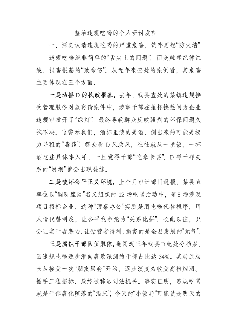 整治违规吃喝的个人研讨发言一、深刻认清违规吃喝的严重危害,筑牢思想“防火墙”违规吃喝绝非简单的“舌尖上的问题”,而是触碰纪律红线、损害根基的“致命伤”。从近年来查处的案例看,其危害主要体现在三个方面:一是动摇D的执政根基。去年,我县查处的某镇违规接受管理服务对象宴请案件中,涉事干部在推杯换盏间为企业违规审批开了“绿灯”,最终导致群众反映强烈的环保问题久拖不决。这警示我们,酒杯里装的是酒,倒出来的可能是权力寻租的“毒药”群众看D风政风,往往就从一顿饭、一杯酒这些具体事入手,一旦觉得干部“吃拿卡要”D群干群关系的“堤坝”就会出现裂缝。二是破坏公平正义环境。上个月审计部门通报,某县直单位以“调研座谈”名义组织的12场吃喝活动中,有8场涉及项目招标企业。这种“酒桌办公”实质是用吃喝代替程序、用人情代替制度,让公平竞争沦为“关系比拼”。长此以往,只会让实干者寒心、让钻营者得利,损害的是全县发展的“元气”三是腐蚀干部队伍肌体。翻阅近三年我县D纪处分档案,因违规吃喝逐步滑向腐败深渊的干部占比达34%。某局原局长从接受一次“朋友聚会”开始,逐步演变为收受高档烟酒、插手工程招标,最终被移送司法机关。事实证明,违规吃喝就是干部腐化堕落的“温床,今天的“小饭局”可能就是明天的“大陷阱”二、深入剖析问题根源,找准整治“突破口”当前,我县违规吃喝问题虽总体可控,但隐形变异现象仍需警惕:有的将公款吃喝转为“私人埋单、企业报销”有的把酒店宴席换成“农家小院、内部食堂”;有的用“茶叶礼盒、海鲜卡券”替代直接宴请。这些问题反复出现,根源主要在三个层面:从思想层面看,不少干部认为“吃点喝点不算啥”,把违规吃喝当作“联络感情”的手段、“开展工作”的方式。在近期座谈中,有干部坦言“项目推进少不了饭局协调”这种将吃喝与工作画等号的思维,本质上是纪律意识淡薄的表现。从制度层面看,“监督盲区”尚未完全消除。虽然我们建立了公务接待清单制度、公款消费公示制度,但对“电子红包转账买单“私人会所定点消费”等新变种,还存在发现难、取证难的问题。某乡镇查处的“虚拟消费券”吃喝案中,涉事人员通过商户暗箱操作兑换烟酒,直到群众举报才得以查实,暴露了监督手段的滞后性。从文化层面看,“无酒不成席”的陋习尚未根除。一些干部把“能喝会劝”当作“社交能力,把“不醉不归”视为“真情实意。甚至有年轻干部反映,刚入职时被“前辈”教导“不会喝酒办不成事”这种庸俗的酒桌文化,对干部队伍特别是年轻一代的侵蚀不容忽视。