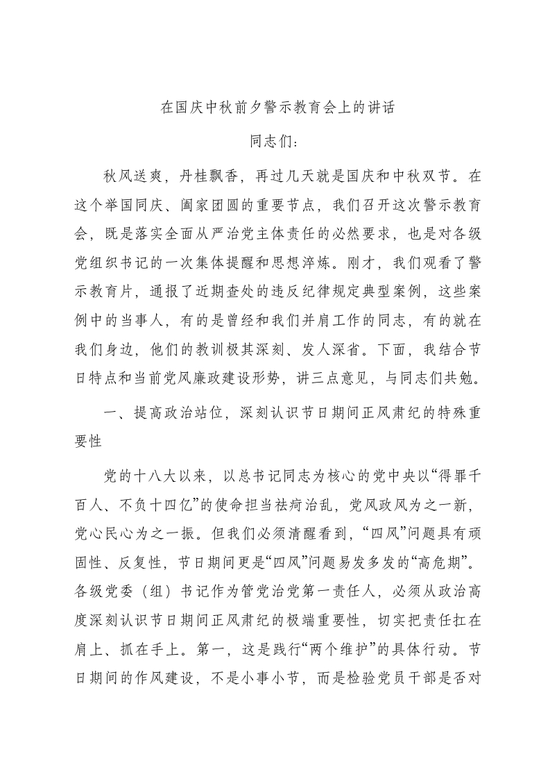 在国庆中秋前夕警示教育会上的讲话同志们:秋风送爽,丹桂飘香,再过几天就是国庆和中秋双节。在这个举国同庆、阖家团圆的重要节点,我们召开这次警示教育会,既是落实全面从严治党主体责任的必然要求,也是对各级党组织书记的一次集体提醒和思想淬炼。刚才,我们观看了警示教育片,通报了近期查处的违反纪律规定典型案例,这些案例中的当事人,有的是曾经和我们并肩工作的同志,有的就在我们身边,他们的教训极其深刻、发人深省。下面,我结合节日特点和当前党风廉政建设形势,讲三点意见,与同志们共勉。一、提高政治站位,深刻认识节日期间正风肃纪的特殊重要性党的十八大以来,以总书记同志为核心的党中央以“得罪千百人、不负十四亿”的使命担当祛疴治乱,党风政风为之一新,党心民心为之一振。但我们必须清醒看到,“四风”问题具有顽固性、反复性,节日期间更是“四风”问题易发多发的“高危期”。各级党委(组)书记作为管党治党第一责任人,必须从政治高度深刻认识节日期间正风肃纪的极端重要性,切实把责任扛在肩上、抓在手上。第一,这是践行“两个维护”的具体行动。节日期间的作风建设,不是小事小节,而是检验党员干部是否对党忠诚的试金石。总书记总书记反复强调,“作风问题本质上是党性问题“对党中央决策部署贯彻落实不力,就是违反政治纪律”。近年来,中央纪委国家监委每逢重大节日都专门印发通知、作出部署,就是要通过管住一个个节点、纠治一个个具体问题,让党员干部知敬畏、存戒惧、守底线。如果我们在节日期间对“四风”问题睁一只眼闭一只眼,甚至放任纵容,就是对党中央决策部署阳奉阴违,就是“两个维护”不坚决、不彻底。各级党委(组)书记要带头从政治上看作风问题,以“零容忍”态度严防节日腐败,确保党中央关于作风建设的各项要求落地生根。第二,这是守护群众获得感的必然要求。群众看党风政风,往往就看身边的党员干部,就看节日期间的作风表现。从通报的案例看,有的干部借节日之机收送名贵特产和礼品礼金,有的违规接受管理服务对象宴请,有的公车私用、私车公养,这些行为看似“人情往来”,实则是权力与利益的交换,直接损害群众对党的信任。“千里之堤,溃于蚁穴”,如果任由这些问题滋生蔓延,就会像一堵无形的墙,把党和人民群众隔开。各级党委(组)书记要始终站稳人民立场,把群众感受作为检验工作的“晴雨表”,通过一个个具体问题的解决,让群众切实感受到全面从严治党就在身边、正风反腐就在眼前。第三,这是防范化解廉政风险的关键举措。节日期间,人