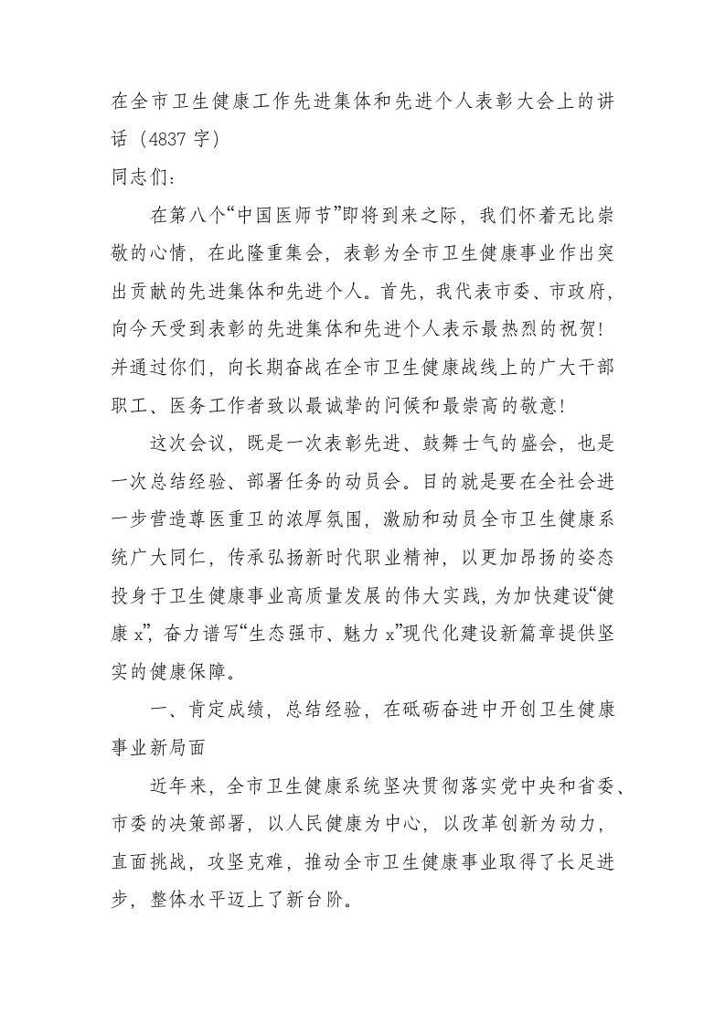 在全市卫生健康工作先进集体和先进个人表彰大会上的讲话(4837字)同志们:在第八个“中国医师节”即将到来之际,我们怀着无比崇敬的心情,在此隆重集会,表彰为全市卫生健康事业作出突出贡献的先进集体和先进个人。首先,我代表市委、市政府,向今天受到表彰的先进集体和先进个人表示最热烈的祝贺!并通过你们,向长期奋战在全市卫生健康战线上的广大干部职工、医务工作者致以最诚挚的问候和最崇高的敬意!这次会议,既是一次表彰先进、鼓舞士气的盛会,也是一次总结经验、部署任务的动员会。目的就是要在全社会进一步营造尊医重卫的浓厚氛围,激励和动员全市卫生健康系统广大同仁,传承弘扬新时代职业精神,以更加昂扬的姿态投身于卫生健康事业高质量发展的伟大实践,为加快建设“健康x”,奋力谱写“生态强市、魅力x”现代化建设新篇章提供坚实的健康保障。一、肯定成绩,总结经验,在砥砺奋进中开创卫生健康事业新局面近年来,全市卫生健康系统坚决贯彻落实党中央和省委、市委的决策部署,以人民健康为中心,以改革创新为动力,直面挑战,攻坚克难,推动全市卫生健康事业取得了长足进步,整体水平迈上了新台阶。(一)公共卫生安全防线持续筑牢。面对复杂严峻的公共卫生形势,全市卫生健康系统始终坚持“人民至上、生命至上”,成功经受住了一轮又一轮的严峻考验。疾病预防控制体系改革深入推进,重大疫情防控救治体系和应急响应能力显著增强,有效保障了人民群众的生命安全和身体健康。全市健康水平核心指标稳步提升,人均预期寿命持续增长,2020年已达到77.75岁,正朝着“十四五”规划累计增长1岁的目标稳步迈进。对比“十三五”时期,主要传染病发病率得到有效控制。公共卫生人才队伍建设得到加强,到2025年,全市每千常住人口专业公共卫生机构人员数预计将达到0.83人,为构建强大的公共卫生体系奠定了坚实的人才基础。(二)医药卫生体制改革纵深推进。改革是推动事业发展的根本动力。我们坚持以改革破难题、激活力,持续深化医药卫生体制改革。紧密围绕群众“看病难、看病贵”问题,积极推动“三医”协同发展和治理,公立医院综合改革不断深化,现代医院管理制度逐步建立。分级诊疗体系日益完善,基层医疗卫生服务能力得到实质性提升,乡村一体化改革成果得到巩固,乡镇卫生院和社区卫生服务中心作为健康“守门人”的能力显著增强。我们积极融入区域协同发展大局,加强与x地区高端医疗资源的共建共享,让广大市民在家门口就能享受到更加优质的医疗服务。(三)健康产业融合发展成效显著。我们立足市情,充分挖掘和利用独特的生态与资源