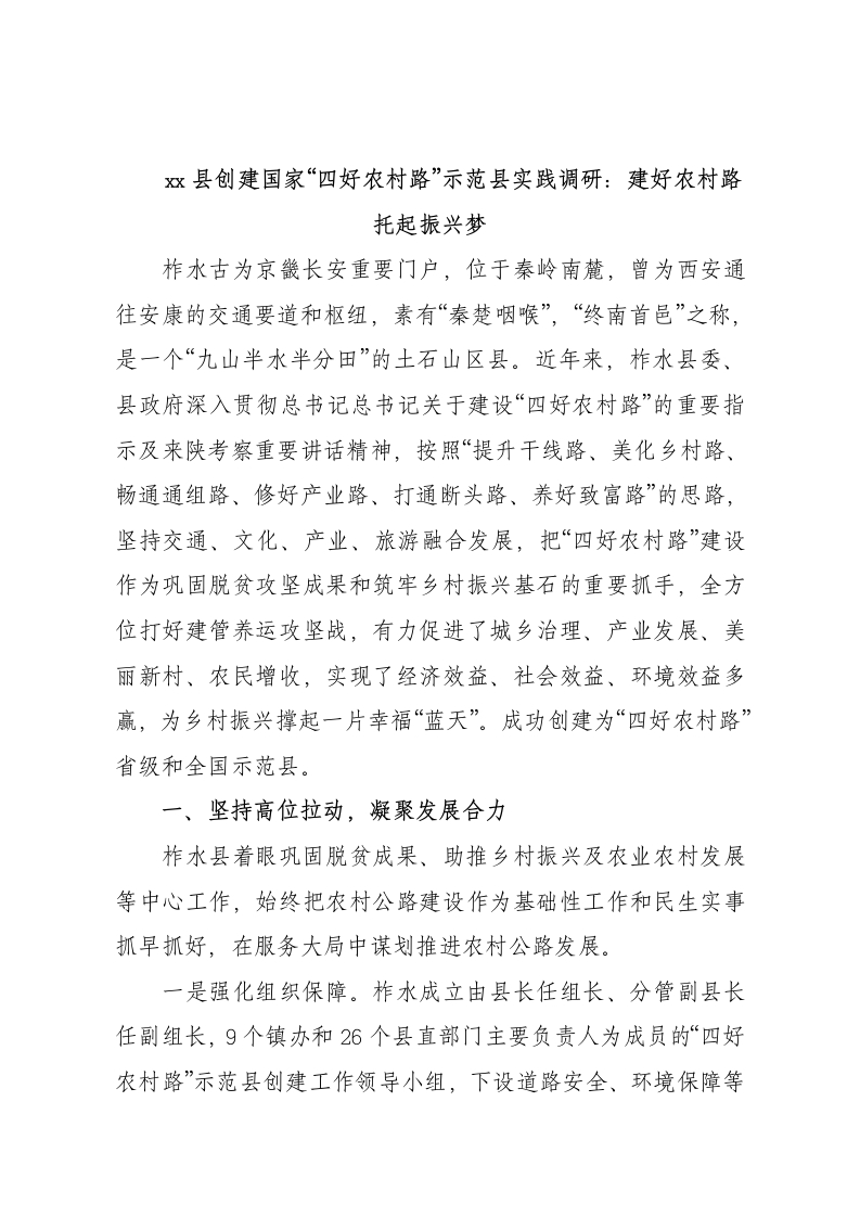 x县创建国家“四好农村路”示范县实践调研:建好农村路托起振兴梦柞水古为京畿长安重要门户,位于秦岭南麓,曾为西安通往安康的交通要道和枢纽,素有“秦楚咽喉”,“终南首邑”之称,是一个“九山半水半分田”的土石山区县。近年来,柞水县委、县政府深入贯彻总书记总书记关于建设“四好农村路”的重要指示及来陕考察重要讲话精神,按照“提升干线路、美化乡村路、畅通通组路、修好产业路、打通断头路、养好致富路”的思路,坚持交通、文化、产业、旅游融合发展,把“四好农村路”建设作为巩固脱贫攻坚成果和筑牢乡村振兴基石的重要抓手,全方位打好建管养运攻坚战,有力促进了城乡治理、产业发展、美丽新村、农民增收,实现了经济效益、社会效益、环境效益多赢,为乡村振兴撑起一片幸福“蓝天”。成功创建为“四好农村路”省级和全国示范县。一、坚持高位拉动,凝聚发展合力柞水县着眼巩固脱贫成果、助推乡村振兴及农业农村发展等中心工作,始终把农村公路建设作为基础性工作和民生实事抓早抓好,在服务大局中谋划推进农村公路发展。一是强化组织保障。柞水成立由县长任组长、分管副县长任副组长,9个镇办和26个县直部门主要负责人为成员的“四好农村路”示范县创建工作领导小组,下设道路安全、环境保障等专项工作组。制定出台了《柞水县推进“四好农村路”建设工作实施方案》《路长制实施方案》等一系列规范性文件,规范指导全县农村公路建设工作。二是强化资金保障。建立农村公路建设管理资金保障制度,将地方建设配套资金、农村公路养护费用等全额纳入财政预算,县镇主干道纳入政府管护范围,让公共资源最大限度为公众服务,每年列支重大交通项目前期资金3000万元。把农村公路纳入灾毁保险范围,拓宽了水毁抢修资金筹集渠道。同时,整合扶贫开发、以工代赈、水利等项目资金,统一纳入农村公路建设补助资金专户,破解了农村公路发展资金碎小散难题。三是强化考核督导。每年年初召开工作部署会、年中召开项目推进会,每月组织道路安全大检查、每季度组织公路养护大巡查。出台了《“四好农村路”创建工作考核办法》,将农村道路建设管护工作纳入各镇办、各相关部门年度考核内容,由县委督查室进行检查考核,明确工作责任,强化目标意识。考核结果与相关单位和镇办绩效考评挂钩,全额纳入财政预算。创建为市级示范镇和县级示范村的各奖励10万元、2000元。二、强化规划引领,提升建设品位柞水县把农村公路建设作为助推乡村振兴的着力点和突破口,作为统筹城乡的支撑和引擎,按照“超前谋划引发展,严把关口保质量”的思路,高起点、高质量、高标准开展农村公路建