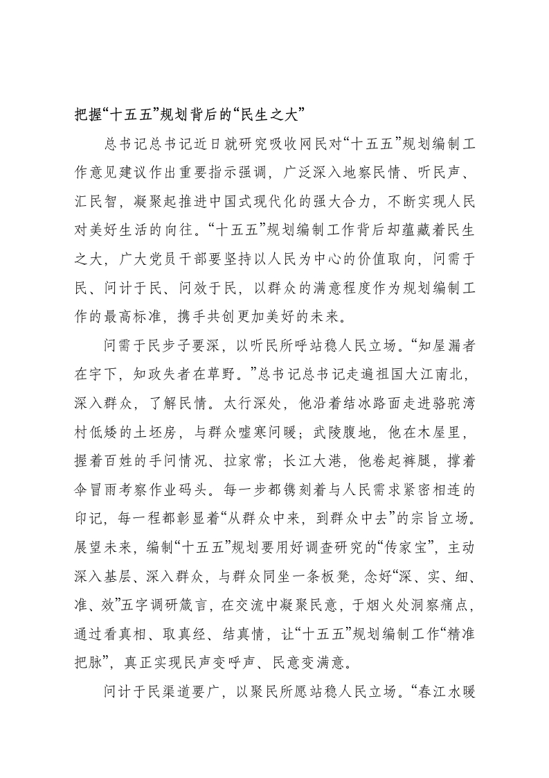 把握“十五五”规划背后的“民生之大”总书记总书记近日就研究吸收网民对“十五五”规划编制工作意见建议作出重要指示强调,广泛深入地察民情、听民声、汇民智,凝聚起推进中国式现代化的强大合力,不断实现人民对美好生活的向往。“十五五”规划编制工作背后却蕴藏着民生之大,广大党员干部要坚持以人民为中心的价值取向,问需于民、问计于民、问效于民,以群众的满意程度作为规划编制工作的最高标准,携手共创更加美好的未来。问需于民步子要深,以听民所呼站稳人民立场。“知屋漏者在宇下,知政失者在草野。”总书记总书记走遍祖国大江南北,深入群众,了解民情。太行深处,他沿着结冰路面走进骆驼湾村低矮的土坯房,与群众嘘寒问暖;武陵腹地,他在木屋里,握着百姓的手问情况、拉家常;长江大港,他卷起裤腿,撑着伞冒雨考察作业码头。每一步都镌刻着与人民需求紧密相连的印记,每一程都彰显着“从群众中来,到群众中去”的宗旨立场。展望未来,编制“十五五”规划要用好调查研究的“传家宝”,主动深入基层、深入群众,与群众同坐一条板凳,念好“深、实、细、准、效”五字调研箴言,在交流中凝聚民意,于烟火处洞察痛点,通过看真相、取真经、结真情,让“十五五”规划编制工作“精准把脉”,真正实现民声变呼声、民意变满意。问计于民渠道要广,以聚民所愿站稳人民立场。“春江水暖鸭先知”,人民群众身处于生产生活第一线,对实践变化感知最敏锐,提出的建议也最管用。2020年,“十四五”规划编制工作开展网上意见征求活动,累计共收到网民建言超101.8万条,网友所提的相关建议最终被写入全会文件,为做好“十四五”规划编制工作提供了有益参考。进入新的历史时期,“十五五”规划编制工作要以民为师,广泛汲取民智,搭建好“线上+线下”问计矩阵。线下通过设立民生热线、用好群众信箱、召开座谈会等方式,及时收集群众政策建议;线上通过开通“百姓视线”“民情直通车”参政问政栏目,开发“十五五”意见建议小程序等方式,推动社情民智创造性落实、创造性转化。以线上线下的全覆盖,提升人民群众的信息触达效率,让更多的人民智慧向上传递,为中国式现代化凝聚起最广泛的建设力量。问效于民功夫要实,以解民所忧站稳人民立场。新时代以来,从打赢人类历史上规模最大的脱贫攻坚战,到建成世界最大的高速铁路网、高速公路网,再到建成世界上规模最大的教育体系、社会保障体系、医疗卫生体系…一件件聚焦民生关切的实事举措,切实增强了人民群众的获得感、幸福感、安全感。当上层设计精准转化为人民群众的所想所愿所盼,一张张“民生清单”才能真正变成“幸福账单”。问效于民,“问”是出发点,“效”才是落脚点。“十五五”规划编制工作要聚焦人民群众的急难愁盼,如污染防治、医疗就业、生育保障、基层设施升级等等,