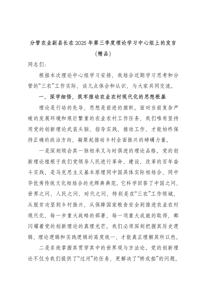 分管农业副县长在2025年第三季度理论学习中心组上的发言(精品)同志们:根据本次理论中心组学习安排,我结合近期学习思考和分管的“三农”工作实际,谈几点体会和认识,与大家共同交流。一、深学细悟,筑牢推动农业农村现代化的思想根基理论是行动的先导,思想是前进的旗帜。面对当前复杂严峻的发展环境和艰巨繁重的农业农村工作任务,我们唯有坚持用党的创新理论武装头脑、指导实践、推动工作,才能始终保持正确的政治方向,凝聚起推动乡村全面振兴的磅礴力量。一是深刻领会其一脉相承又与时俱进的理论品格。党的创新理论植根于我们党领导人民进行革命、建设、改革的百年奋斗实践,是马克思主义基本原理同中国具体实际相结合、同中华优秀传统文化相结合的光辉典典范。它科学回答了中国之问、世界之问、人民之问、时代之问,特别是在“三农”工作领域,从脱贫攻坚到乡村振兴,从保障国家粮食安全到推进农业农村现代化,每一步重大战略的部署、每一项重大成就的取得,都闪耀着党的创新理论的真理光芒。我们必须深刻把握其历史逻辑、理论逻辑和实践逻辑的高度统一,才能真正理解其所以然。二是系统掌握其贯穿其中的世界观与方法论。党的创新理论不仅为我们提供了“过河”的任务,更解决了“桥或船”的问题。其中蕴含的“六个必须坚持”等立场观点方法,是指导我们认识世界、改造世界的强大思想武器。应用到“三农”工作中,坚持人民至上,就是要把农民群众的利益放在最高位置:坚持自信自立,就是要立足本县资源禀赋走特色农业发展之路:坚持守正创新,就是要传承农耕文明,同时拥抱现代科技;坚持问题导向,就是要聚焦我县农业发展的短板弱项精准发力;坚持系统观念,就是要统筹推进乡村发展、乡村建设、乡村治理;坚持胸怀天下,就是要在大变局中思考如何端牢我们自己的饭碗。三是深切感悟其指导实践、推动发展的强大伟力。理论的价值在于指导实践,其生命力也蕴含于实践之中。党的创新理论正是在不断回答时代和实践提出的新课题中向前发展的。进入新发展阶段,如何加快建设农业强县、如何拓宽农民增收致富渠道、如何建设宜居宜业和美乡村,这些都是摆在我们面前的重大课题。我们必须紧密结合X县的实际,在学思践悟中找到破解难题的金钥匙,真正把理论学习的成果转化为推动我县农业高质高效、乡村宜居宜业、农民富裕富足的生动实践。二、担当实干,以新发展理念引领X县“三农”工作高质量发展2025年是实现“十四五”规划目标任务的关键一年,也是全面推进乡村振兴、加快建设农业强县的攻坚之年。我们要坚持以党的创新理论为指导,完整、准确、全面贯彻新发展理念,