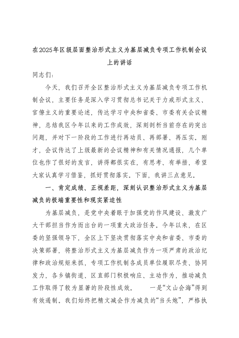 在2025年区级层面整治形式主义为基层减负专项工作机制会议上的讲话同志们:今天,我们召开全区整治形式主义为基层减负专项工作机制会议,主要任务是深入学习贯彻总书记关于力戒形式主义、官僚主义的重要论述,传达学习中央和省委、市委有关会议精神,总结我区今年以来的工作成效,深刻剖析当前存在的突出问题,并对下一阶段的工作进行再动员、再部署、再压实。刚才,会议传达了上级最新的会议精神和有关情况通报,几个单位也作了很好的发言,讲得都很实在,有思考、有举措,希望大家认真学习借鉴,抓好贯彻落实。下面,我讲三点意见。一、肯定成绩、正视差距,深刻认识整治形式主义为基层减负的极端重要性和现实紧迫性为基层减负,是党中央着眼于加强党的作风建设、激发广大干部担当作为而出台的一项重大政治任务。今年以来,在区委的坚强领导下,全区上下坚决贯彻落实中央和省委、市委的决策部署,将整治形式主义为基层减负作为一项严肃的政治纪律和政治规矩来抓,专项工作机制各成员单位履职尽责、协同发力,各乡镇街道、区直部门积极响应、主动作为,推动减负工作取得了较为显著的阶段性成效。一是“文山会海”得到有效遏制。我们始终把精文减会作为减负的“当头炮”,严格执行年度发文、会议计划,从源头上拧紧了“水龙头”。据统计,截至今年8月底,以区委、区政府名义印发的文件数量同比下降约18%,召开的全区性会议数量同比减少超过21%,会议时长和参会范围也得到了有效控制。许多同志反映,现在不必要的会议少了,文件短了,有更多的时间和精力可以深入一线、服务群众。二是督查检查考核更加规范有序。我们持续深化督检考统筹整合,严格执行年度计划和审批报备制度,坚决纠治多头督查、重复检查、随意考核等问题。通过整合归并,全区性督检考事项总量较去年同期压减了近20%。我们还积极探索运用信息化、大数据等手段开展“云督查“线上考”,有效减轻了基层迎检迎考的事务性负担,让基层干部能够心无旁骛地抓落实、谋发展。三是基层权责边界逐步厘清。我们聚焦基层治理中的难点堵点,大力推进“一枚印章管审批“一支队伍管执法”等改革,推动资源、服务、管理向基层下沉。同时,严格规范“属地管理”事项,建立准入机制和动态调整清单,有效避免了上级部门“层层甩锅”、责任下移的问题,让乡镇街道能够集中精力履行好加强党的建设、推动区域发展、组织公共服务、实施综合管理等主责主业。四是若干突出问题得到专项治理。我们紧盯“指尖上的形式主义”、创建示范活动过多过滥、违规借调干部等基层反映强烈的突出问题,开展了多轮次的专项清理和整治。全区范围内对政务移动应用程序、AAA工作群进行了全面