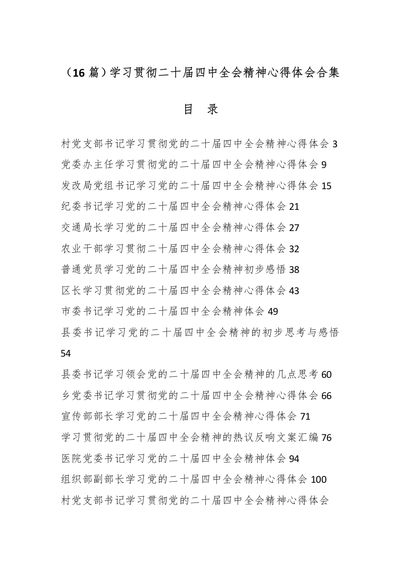 (16篇)学习贯彻二十届四中全会精神心得体会合集目录村党支部书记学习贯彻党的二十届四中全会精神心得体会3党委办主任学习贯彻党的二十届四中全会精神心得体会9发改局党组书记学习党的二十届四中全会精神心得体会15纪委书记学习党的二十届四中全会精神心得体会21交通局长学习党的二十届四中全会精神心得体会27农业干部学习贯彻二十届四中全会精神心得体会32普通党员学习党的二十届四中全会精神初步感悟38区长学习贯彻党的二十届四中全会精神心得体会43市委书记学习党的二十届四中全会精神体会49县委书记学习党的二十届四中全会精神的初步思考与感悟54县委书记学习领会党的二十届四中全会精神的几点思考60乡党委书记学习贯彻党的二十届四中全会精神心得体会66宣传部部长学习党的二十届四中全会精神心得体会71学习贯彻党的二十届四中全会精神的热议反响文案汇编76医院党委书记学习党的二十届四中全会精神体会94组织部副部长学习党的二十届四中全会精神心得体会100村党支部书记学习贯彻党的二十届四中全会精神心得体会金秋十月,丹桂飘香,举世瞩目的中国共产党第二十届中央委员会第四次全体会议在北京胜利召开。作为一名身处基层一线的村党支部书记,我怀着激动的心情,通过新闻报道第一时间学习了会议公报和相关解读。灯下捧读,反复思量,全会精神如同一股暖流,涌入心田,又如同一座灯塔,照亮了前行的道路。这不仅仅是一次高屋建瓴的理论指导,更是一份沉甸甸的行动纲领,为我们基层工作者指明了方向,注入了强大的精神动力。结合我们X村的实际情况,我谈三点粗浅的认识、体会与打算,希望能与同志们共勉。一、深化思想认识,把握精神实质初读全会公报,感觉内容博大精深,似乎与我们偏远山村的日常有些距离。但静下心来细细品味,才发觉其中的每一个字、每一句话,都与我们老百姓的生活息息相关,都为我们解决村里的难题提供了“金钥匙”。我认识到,这次全会的核心,是聚焦于推进国家治理体系和治理能力现代化这个重大命题。对于国家而言,这是宏大的战略布局;而对于我们一个小小的X村来说,这就是要求我们把村里的事情管得更科学、更公平、更有效率。过去,村里解决矛盾纠纷,可能更多依赖“老辈子”的威望或者“和稀泥”式的调解。但现在,全会精神告诉我们,要建立健全党组织领导下的自治、法治、德治相结合的乡村治理体系。这意味着,我们要把村规民约完善起来,让大家的行为有章可循;要把村务监