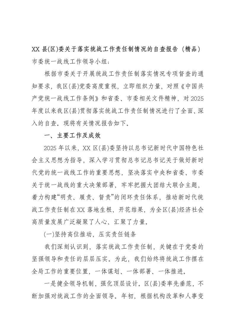 XX县(区)委关于落实统战工作责任制情况的自查报告(精品)市委统一战线工作领导小组:根据市委关于开展统战工作责任制落实情况专项督查的通知要求,我区(县)党委高度重视,立即组织力量,对照《中国共产党统一战线工作条例》和省委、市委相关文件精神,对2025年度以来我区(县)贯彻落实统战工作责任制情况进行了全面、深入的自查。现将有关情况报告如下。一、主要工作及成效2025年以来,X区(县)委坚持以总书记新时代中国特色社会主义思想为指导,深入学习贯彻总书记总书记关于做好新时代党的统一战线工作的重要思想,坚决落实中央和省委、市委关于统一战线的重大决策部署,牢牢把握大团结大联合主题,着力构建“明责、履责、督责”的闭环责任体系,推动新时代统战工作责任制在X落地生根、开花结果,为全区(县)经济社会高质量发展广泛凝聚了人心、汇聚了力量。(一)坚持高位推动,压实责任链条我们深刻认识到,落实统战工作责任制,关键在于党委的坚强领导和责任的层层压实。为此,我们始终将统战工作摆在全局工作的重要位置,一体谋划、一体部署、一体推进。一是健全领导机制,强化顶层设计。区(县)委率先垂范,不断加强对统战工作的全面领导。年初,根据机构改革和人事变动情况,及时修订并完善了区(县)委统一战线工作领导小组(区(县)委对台工作领导小组)工作规则,进一步明确了领导小组的议事范围、决策程序和工作要求。同时,结合新形势新任务,我们对领导小组办公室工作细则和各成员单位的工作职责进行了重新梳理和界定,确保各单位职能清晰、任务明确、协同高效。今年以来,区(县)委常委会专题研究统战工作4次,区(县)委统一战线工作领导小组召开全体会议2次,高位协调解决了民族宗教领域风险防范、民营经济发展环境优化等一批重点难点问题。二是构建责任体系,实现全面覆盖。为破解基层统战工作“谁来抓、抓什么、怎么抓”的难题,我们着力构建横向到边、纵向到底的责任网络。在纵向层面,制定并施行了《乡镇(街道)统战委员、村(社区)党支部书记、村级统战联络员工作责任清单》,首次将责任主体延伸至村(社区)一级,明确了基层统战工作的主体、职责和任务,构建起“区(县)委一乡镇(街道)党(工)委一村(社区)党支部”三级联动、全面覆盖的责任体系,确保了党的统战工作方针政策在基层有人管、有人抓、有人干。三是强化主体责任,厘清职责边界。为推动各级党委(党组)真正把主体责任扛在肩上,我们秉持可量化、能落地、好操作的原则,制定实施了《党委(党组)履行统战主体责任年度综合评价事项清单》,将责任具体化、指标化。清单明确了党委(党组)