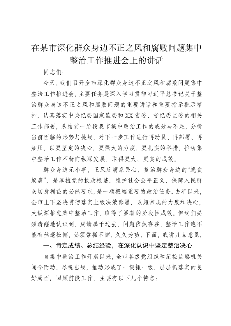 在某市深化群众身边不正之风和腐败问题集中整治工作推进会上的讲话同志们:今天,我们召开全市深化群众身边不正之风和腐败问题集中整治工作推进会,主要任务是深入学习贯彻习近平总书记关于整治群众身边不正之风和腐败问题的重要讲话和重要指示批示精神,认真落实中央纪委国家监委和X省委、省纪委监委的相关工作部署,总结前一阶段我市集中整治工作的成效与不足,分析当前面临的形势与挑战,对下一步工作进行再动员、再部署、再加压,以更坚定的决心、更强大的力度、更扎实的举措,推动集中整治工作不断向纵深发展,取得更大、更实的成效。群众身边无小事,正风反腐系民心。整治群众身边的“蝇贪蚁腐”,是厚植党的执政根基、维护社会公平正义、保障人民群众切身利益的必然要求,是一项极端重要的政治任务。去年以来,全市上下坚决贯彻落实上级决策部署,以超常规的力度和决心,大纵深推进集中整治工作,取得了显著的阶段性成效。但我们必须清醒地认识到,成绩属于过去,问题依然存在,整治工作绝不能有丝毫松懈,必须常抓不懈、久久为功。下面,我讲几点意见。一、肯定成绩、总结经验,在深化认识中坚定整治决心自集中整治工作开展以来,全市各级党组织和纪检监察机关闻令而动、尽锐出战,推动形成了一级抓一级、层层抓落实的良好局面。回顾前段工作,主要有以下几个特点:第一,组织领导坚强有力,高位推动形成强大合力。市委始终将此项工作作为一项重大政治任务来抓,成立了由主要负责同志牵头的领导小组,定期听取汇报、研究问题、部署任务,确保了政治方向不偏、工作力度不减。各县区、各部门也迅速行动,建立了相应的工作机制,主要负责同志亲自挂帅、靠前指挥,形成了上下贯通、横向联动、齐抓共管的强大工作合力。这种高站位、高标准、高效率的组织领导,为集中整治工作的顺利开展提供了最坚实的政治保障。第二,办案震慑持续强化,重拳出击彰显法纪威严。全市纪检监察机关坚持把查办案件作为最直接、最有效的手段,紧盯关键领域和重点环节,对群众反映强烈的突出问题线索进行“大起底”“大清仓”,优先处置、快查快办。据统计,去年以来,全市共立案审查调查涉及群众身边不正之风和腐败问题的案件1200余件,给予党纪政务处分1150人,移送司法机关98人。通过严肃查处一批隐藏在群众身边的“蝇贪“蚁腐”,释放了“莫伸手、伸手必被捉”的强烈信号,形成了强有力的震慑效应,有效遏制了基层微腐败的蔓延势头。第三,专项整治有力推进,靶向施治破解顽瘴痼疾。我们坚持问题导向,聚焦群众最关心、最直接、最现实的利益问题,系统抓好中央及省里统一部署的各项专项整治任务。特别是在乡村振兴资金监管、养老服务、医保基金使用等重点领域,我们集中精锐力量,打好了一场场“突击战”和“攻坚战”。例如,在乡村振