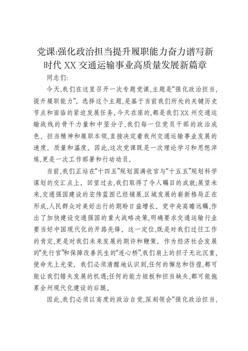 党课:强化政治担当提升履职能力奋力谱写新时代XX交通运输事业高质量发展新篇章同志们:今天,我们在这里召开一次专题党课,主题是“强化政治担当,提升履职能力”。选择这个主题,是基于当前我们所处的关键历史节点和面临的紧迫发展任务。今天在座的,都是我们XX州交通运输战线的骨干力量和中坚分子,我们每一位党员干部的政治成色、担当精神和履职本领,直接决定着我州交通运输事业发展的速度、质量和温度。因此,这次党课既是一次理论学习和思想淬炼,更是一次工作部署和行动动员。当前,我们正站在“十四五”规划圆满收官与“十五五”规划科学谋划的交汇点上。回望过去,我们取得了令人瞩目的成就:展望未来,交通强国建设的宏伟蓝图已经铺展,区域发展的崭新格局正在形成,人民群众对美好出行的期盼日益增长。党中央高瞻远瞩,作出了加快建设交通强国的重大战略决策,明确要求交通运输行业要当好中国现代化的开路先锋。这一定位,既是对我们过往工作的肯定,更是对我们未来发展的期许和鞭策。作为经济社会发展的“先行官和保障改善民生的“连心桥”,我们肩上的担子无比沉重,使命无上光荣。我们必须清醒地认识到,任何的懈怠和彷徨,都可能让我们错失发展的机遇;任何的能力短板和担当缺失,都可能拖累全州现代化建设的后腿。因此,我们必须以高度的政治自觉,深刻领会“强化政治担当,提升履职能力”的极端重要性和现实紧迫性。这不仅仅是一句口号,而是对我们每一位交通人政治品格和专业素养的根本要求。下面,我将结合我们的行业实际,从四个方面与同志们进行深入交流。一、提高政治站位,深刻认识新时代交通人的政治担当与历史使命政治担当,是共产党人最鲜明的政治品格。对我们交通人而言,讲政治、有担当,不是空洞的表态,而是要具体地、现实地体现在我们谋划、建设、管理、养护、运营交通事业的全过程和各方面。首先,强化政治担当,就是要始终同党中央保持高度一致,坚决贯彻落实党的路线方针政策。党的十八大以来,以习近平同志为核心的党中央对交通运输工作作出了一系列重要论述和指示批示,从“交通大国”向“交通强国”迈进,到构建现代化高质量综合立体交通网,再到推动“四好农村路”高质量发展,为我们指明了前进方向,提供了根本遵循。我们必须持续深入学习领会,确保中央的决策部署在XX州不折不扣地落地生根。我们谋划的每一条线路,建设的每一个项目,出台的每一项政策,都必须首先从政治上看,看是否符合中央精神,是否有利于服务国家重大战略,是否有利于推动区域协调发展,是否有利于增进人民福祉。其次,强化政治担当,就是要主动服务于全州经济社会发展大局。交通是经济的脉络,是发展的先行棋。当前,我州正处于产业