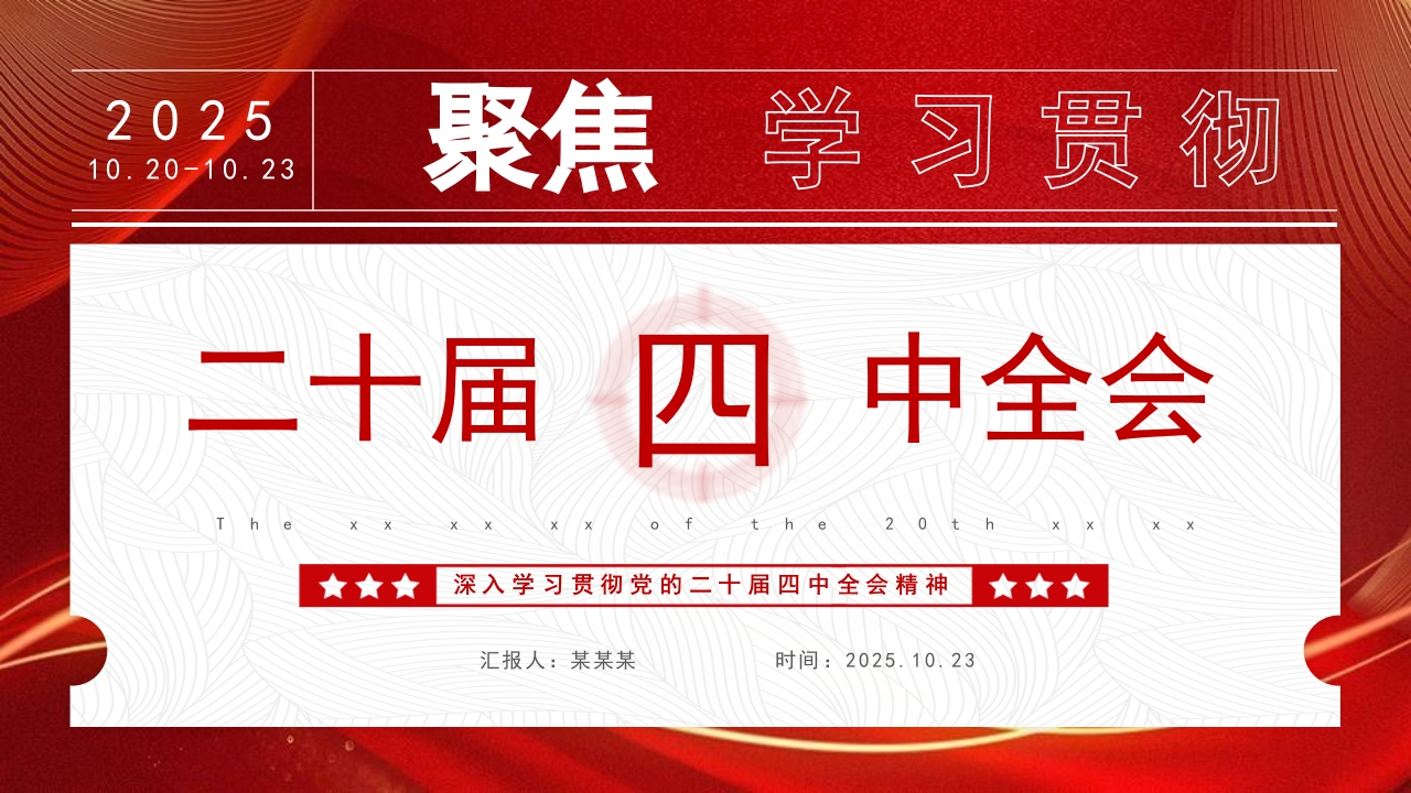 202510.20-10.23聚焦学习贯彻二十届四中全会深入学习贯彻党的二十届四中全会精神汇报人:某某某时间:2025.10.23·出席这次全会的有,中央委员168人,候补中央委员147人。中央纪律检查委员会常务委员会委前言员和有关方面负责同志列席会议。党的二十大代表中部分基层同志和专家学者也列席了会议。·全会由中央政治局主持。中央委员会总书记习近平作了重要讲话。·全会听取和讨论了习近平受中央政治局委托所作的工作报告,审议通过了《中共中央关于制定国民经济和社会发展第十五个五年规划的建议》。习近平就《建议(讨论稿)》向全会作了说明。