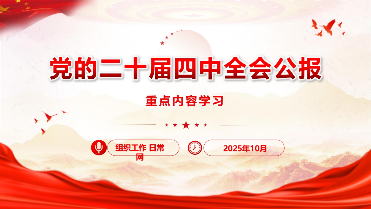 党的二十届四中全会公报重点内容学习★★★★★组织工作日常2025年10月网中国共产党第二十届中央委员会第四次全体会议公报会期2025年10月20日至23日地点北京全会听取和讨论了习近平受中央政治局委托所作的工作报告,审议通过了《中共中央关于制定国民经济和社会发展第十五个五年规划的建议》。习近平就《建议(讨论稿)》向全会作了说明。二十届四中全会Communist Party of China