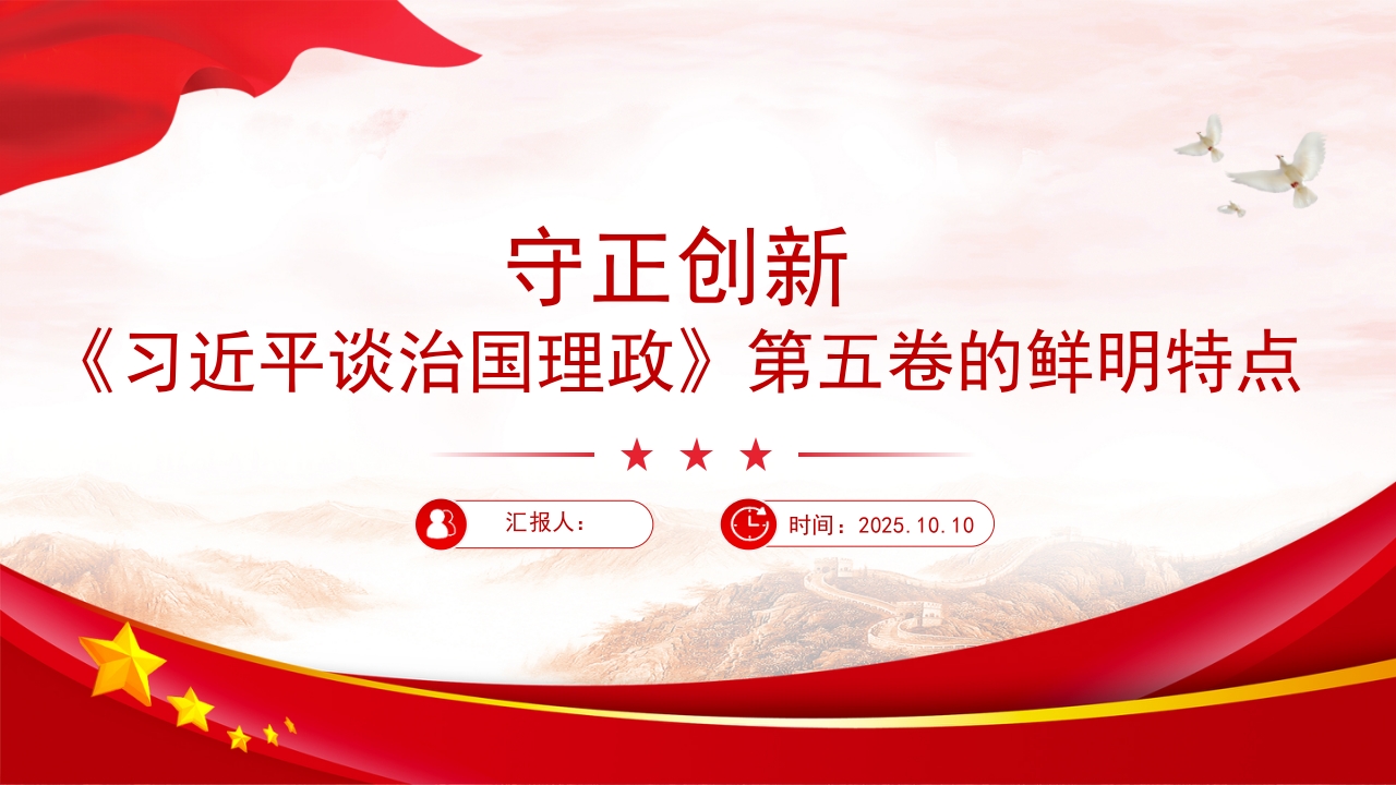 守正创新《习近平谈治国理政》第五卷的鲜明特点汇报人:时间:2025.10.10☆守正创新《习近平谈治国理政》第五卷的鲜明特点经党中央批准,《习近平谈治国理政》第五卷正式出版发行,这是党和国家政治生活中的一件大事。中央党史和文献研究院能够参加编辑工作,感到十分光荣。这部重要著作是全面系统反映习近平新时代中国特色社会主义思想最新成果的权威著作。认真研读这部重要著作,我们深切体会到,守正创新是贯穿全书的鲜明特点,充分彰显了习近平新时代中国特色社会主义思想的理论品格和独特魅力。