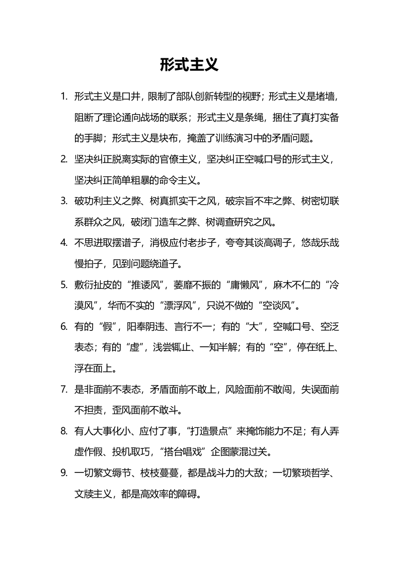 形式主义1.形式注义是口井,限制了部队创新转型的视野;形式注义是堵墙,阻断了理论通向战场的联系;形式主义是条绳,捆住了真打实备的手脚;形式主义是块布,掩盖了训练演习中的矛盾问题。2.坚决纠正脱离实际的官僚主义,坚决纠正空喊口号的形式主义,坚决纠正简单粗暴的命令主义。3.破功利住义之弊、树真抓实干之风,破宗旨不牢之弊、树密切联系群众之风,破闭门造车之弊、树调查研究之风。4.不思进取摆谱子,消极应付老步子,夸夸其谈高调子,悠哉乐哉慢拍子,见到问题绕道子。5.敷衍扯皮的“推诿风”,萎靡不振的“庸懒风”,麻木不仁的“冷漠风”,华而不实的“漂浮风”,只说不做的“空谈风”。6.有的“假”,阳奉阴违、言行不一;有的“大”,空喊口号、空泛表态;有的“虚”,浅尝辄止、一知半解;有的“空”,停在纸上、浮在面上。7.是非面前不表态,矛盾面前不敢上,风险面前不敢闯,失误面前不担责,歪风面前不敢斗。8.有人大事化小、应付了事,“打造景点”来掩饰能力不足;有人弄虚作假、投机取巧,“搭台唱戏”企图蒙混过关。9.一切繁文缛节、枝枝蔓蔓,都是战斗力的大敌;一切繁琐哲学、文牍主义,都是高效率的障碍。10.比“多干”不比“多看”、比“进球”不比“传球”、比“作品”不比“"作秀”、比“口碑”不比“口号”。11.“宅”在高楼大厦,沟通"键来键往”;“躲”于深宅大院,交流“电来电往”;“浮”于文山会海,工作“文来文往”。12.任何愿景,只有在落实中才能实现;任何机遇,只有在落实中才能把握;任何难题,只有在落实中才能破解。13.”痕迹主义”必须叫停,“责任甩锅”必须防止,“问责走样”必须纠正,“督查检查”必须精简。14.谈发展形势一片大“"好”,谈未来愿景空前绝“好”,谈举措办法创新特"好”。15.多一些执著、少一些浮躁;多一些艰苦、少一些安逸;多一些实干、少一些空谈。16.沉迷于物质享受“不爱学”,热衷于装点门面“不真学”,停留在浅尝辄止“不深学”。17.学习教育“搞应付”,调查研究“走过场”,检视问题“不深刻”,整改落实“轻飘飘”。18.只分解任务不承担责任,只调度材料不协调服务,只督查考核不解决问题。19.在层层表态上做文章,在次次开会上兜圈子,在处处造盆景上动脑筋。20.“机械式”落实,“走秀式”调研,“软钉子”接待,“选择性”检查。