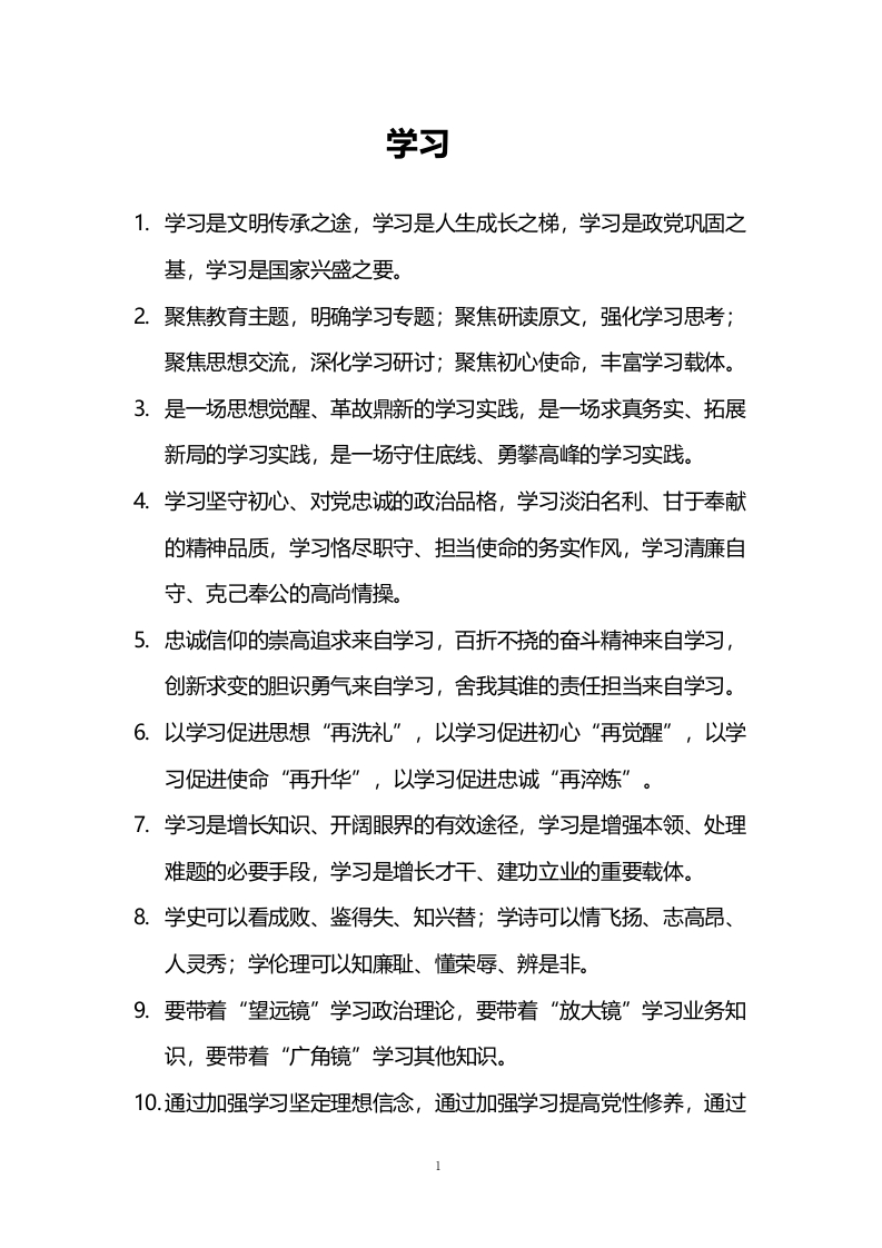 学习1.学习是文明传承之途,学习是人生成长之梯,学习是政党巩固之基,学习是国家兴盛之要。2.聚焦教育主题,明确学习专题;聚焦研读原文,强化学习思考;聚焦思想交流,深化学习研讨;聚焦初心使命,丰富学习载体。3.是一场思想觉醒、革故鼎新的学习实践,是一场求真务实、拓展新局的学习实践,是一场守住底线、勇攀高峰的学习实践。4.学习坚守初心、对党忠诚的政治品格,学习淡泊名利、甘于奉献的精神品质,学习恪尽职守、担当使命的务实作风,学习清廉自守、克己奉公的高尚情操。5.忠诚信仰的崇高追求来自学习,百折不挠的奋斗精神来自学习,创新求变的胆识勇气来自学习,舍我其谁的责任担当来自学习。6.以学习促进思想“再洗礼”,以学习促进初心“再觉醒”,以学习促进使命“再升华”,以学习促进忠诚“再淬炼”。7.学习是增长知识、开阔眼界的有效途径,学习是增强本领、处理难题的必要手段,学习是增长才干、建功立业的重要载体。8.学史可以看成败、鉴得失、知兴替;学诗可以情飞扬、志高昂、人灵秀;学伦理可以知廉耻、懂荣辱、辨是非。9.要带着“望远镜”学习政治理论,要带着“放大镜”学习业务知识,要带着“广角镜”学习其他知识。10.通过功加强学习坚定理想信念,通过加强学习提高党性修养,通过加强学习提升道德素质。11.树立学习力是竞争力的理念,树位学习力是发展力的理念,树立学习力是创新力的理念。12.学习可以提升思想纯度,学习可以提升增强担当力度,学习可以提升锤炼作风硬度13.学习意识明显提高,学习成效明显进步,学习作风明显转变,学习成果有明显增强。14.把学习当作一种工作责任,把学习当作一种生活方式,把学习当作一种精神追求。15.学习时间落实从严,学习人员落实从严,学习内容落实从严,学习制度落实从严。16.立足学习“出发点”,找准学习“兴奋点”,把牢学习“结合点”,注重学习“落脚点”。17.学出坚定信仰信念,学出对党绝对忠诚,学出鲜明人民立场,学出永恒政治本色。18.原原本本学,融会贯通学,自觉主动学,联系实际学,笃信笃行学。19.学习需要抓常的决心,学习需要长抓的耐心,学习需要持久的韧劲。20.学习认识一刻不能麻痹,学习精神一刻不能松解,学习作风一刻不能疲软。21以理论学习打头,以理论学习贯穿,以理论学习带动,以理论学