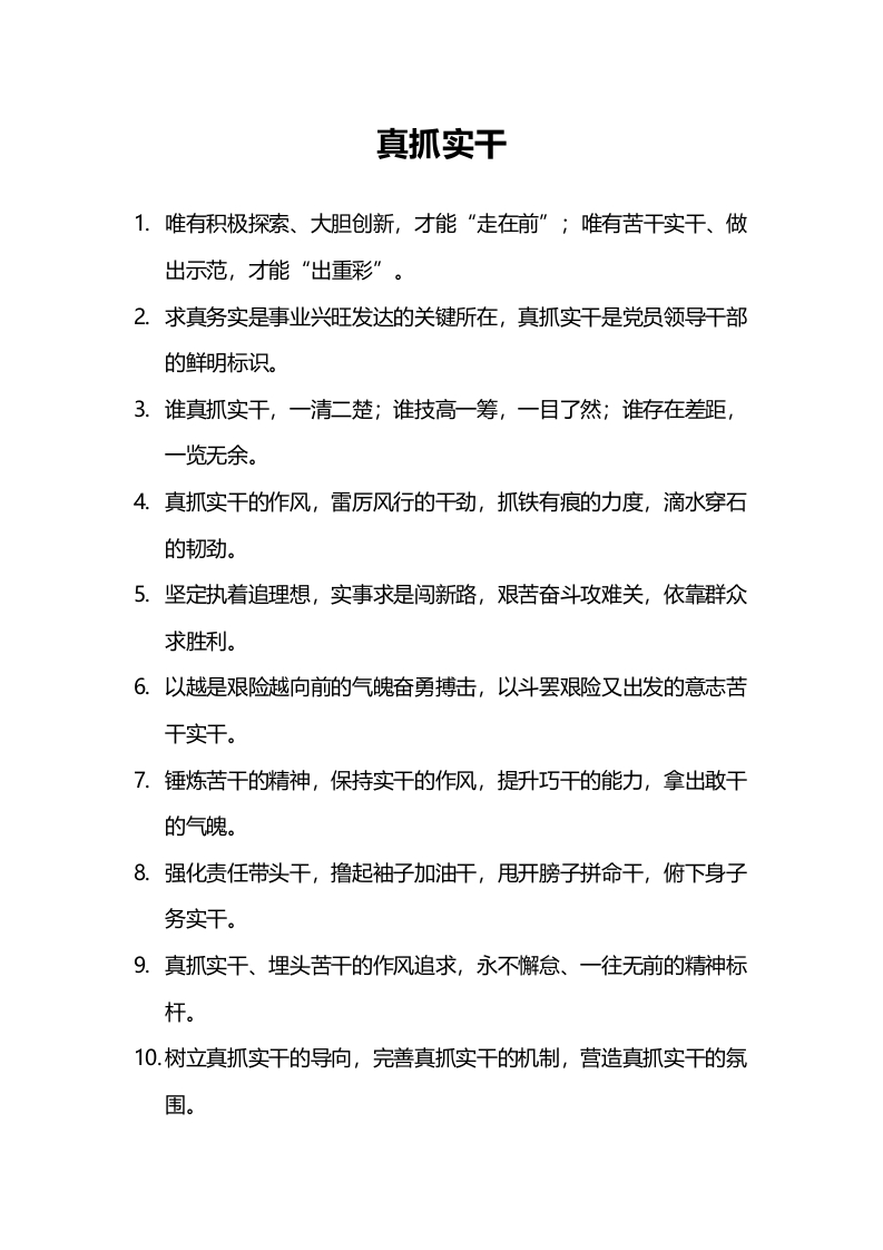 真抓实干1.唯有积极探索、大胆创新,才能“"走在前”;唯有苦干实干、做出示范,才能“出重彩”。2.求真务实是事业兴旺发达的关键所在,真抓实干是党员领导千部的鲜明标识。3.谁真抓实干,一清二楚;谁技高一筹,一目了然;谁存在差距,一览无余。4.真抓实干的作风,雷厉风行的干劲,抓铁有痕的力度,滴水穿石的韧劲。5.坚定执着追理想,实事求是闯新路,艰苦奋斗攻难关,依靠群众求胜利。6.以越是艰险越向前的气魄奋勇搏击,以斗罢艰险又出发的意志苦7.锤炼苦干的精神,保持实干的作风,提升巧干的能力,拿出敢干的气魄。8.强化责任带头干,撸起袖子加油干,甩开膀子拼命干,俯下身子务实干。9.真抓实干、埋头苦干的作风追求,永不懈怠、一往无前的精神标杆。10.树立真抓实干的导向,完善真抓实干的机制,营造真抓实干的氛围。11.把宗旨意识体现在真抓实干中,把正确政绩观贯穿在干事创业里。12.在实干中形成共识,在实干中解决问题,在实干中实现愿景。13.在工作上奋力争先,在实干上奋力出彩,在绩效上奋力进位。14.实干才能把握机遇,实干才能破解难题,实干才能开创新局。15.时不我待的紧迫感,舍我淇谁的责任感,苦干实干的精气神。16.没有奋斗,就创造不了历史;没有实干,就成就不了未来。17.真抓实干求实效,低调务实不张扬,不达目的不罢休。18.敢闯敢试的魄力,真抓实干的作风,攻坚克难的勇气。19.真抓实干求实效,砥砺奋进敢创新,扎根实践提本领。20.争当实干家、不当评论家,争当实践者、不当观察员。21.甩开膀子大胆干,扑下身子踏实干,动起脑子用心干。22.直面艰难险阻,展现斗争力量,坚持真抓实干。23.保持火热激情,力行真抓实干,锤炼过硬作风。24.勇做“攀登者”“挑山工”,争当“实干家”“促进派”。25.用奋斗实现人生价值,用实干圆梦伟大时代。26.强化“真抓”的作风,提升"会抓”的本领。27.没有等出来的精彩,只有干出来的辉煌。28.干在实处永无止境,勇立潮头方显担当。29.一个个行动,一项项举措,一桩桩实事。30.真抓才能攻坚克难,实干才能梦想成真。31.以高站位开阔心胸,以高觉悟真抓实干。32.常怀感恩报恩之心,鼓足实干进取之劲。