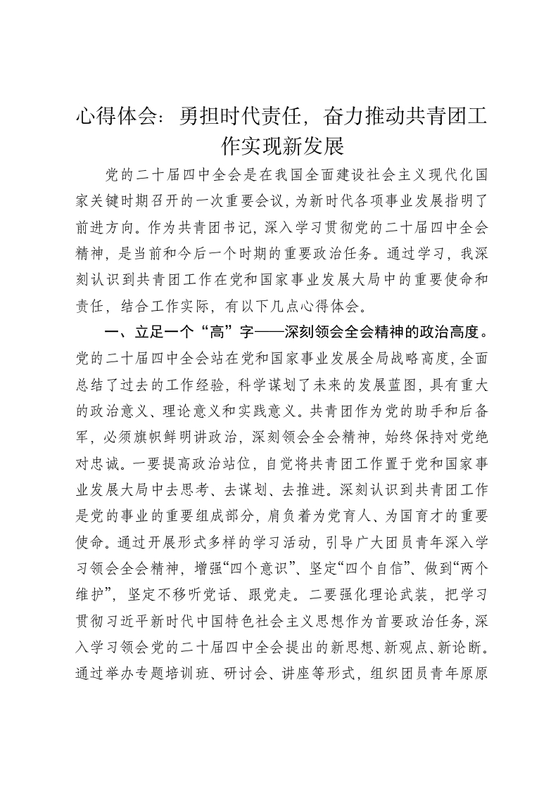 心得体会:勇担时代责任,奋力推动共青团工作实现新发展党的二十届四中全会是在我国全面建设社会主义现代化国家关键时期召开的一次重要会议,为新时代各项事业发展指明了前进方向。作为共青团书记,深入学习贯彻党的二十届四中全会精神,是当前和今后一个时期的重要政治任务。通过学习,我深刻认识到共青团工作在党和国家事业发展大局中的重要使命和责任,结合工作实际,有以下几点心得体会。一、立足一个“高”字一深刻领会全会精神的政治高度。党的二十届四中全会站在党和国家事业发展全局战略高度,全面总结了过去的工作经验,科学谋划了未来的发展蓝图,具有重大的政治意义、理论意义和实践意义。共青团作为党的助手和后备军,必须旗帜鲜明讲政治,深刻领会全会精神,始终保持对党绝对忠诚。一要提高政治站位,自觉将共青团工作置于党和国家事业发展大局中去思考、去谋划、去推进。深刻认识到共青团工作是党的事业的重要组成部分,肩负着为党育人、为国育才的重要使命。通过开展形式多样的学习活动,引导广大团员青年深入学习领会全会精神,增强“四个意识”、坚定“四个自信”、做到“两个维护”,坚定不移听党话、跟党走。二要强化理论武装,把学习贯彻习近平新时代中国特色社会主义思想作为首要政治任务,深入学习领会党的二十届四中全会提出的新思想、新观点、新论断。通过举办专题培训班、研讨会、讲座等形式,组织团员青年原原本本学、深入系统学、联系实际学,不断提高团员青年的政治理论水平和政治素养。三要加强思想政治引领,充分发挥共青团的组织优势和阵地优势,通过开展主题团日、志愿服务、社会实践等活动,引导广大团员青年树立正确的世界观、人生观、价值观,坚定理想信念,厚植爱国情怀。同时,要关注团员青年的思想动态,及时了解他们的需求和困惑,做好解疑释惑和心理疏导工作,帮助他们健康成长成才。二、聚焦一个“新”字一准确把握共青团工作的创新方向。党的二十届四中全会为共青团工作带来了新机遇、新挑战,也提出了新要求、新任务。共青团必须准确把握时代脉搏,聚焦一个“新”字,不断创新工作理念、工作方式和工作载体,推动共青团工作实现新发展。一要创新工作理念,树立以青年为中心的工作导向,关注青年需求,倾听青年声音,解决青年问题。尊重青年的主体地位和首创精神,鼓励青年积极参与共青团工作,激发青年的创新创造活力。同时,要树立开放、共享、融合的工作理念,加强与社会各界的合作与交流,整合资源,形成工作合力。二要创新工作方式,积极运用互联网、大数据、人工智能等新技术手段,打造线上线下相结合的工作模式。通过建设共青团新媒体平台,开展线上主题活动、线上培训、线上服务等,提高共青团工作的覆盖面和影响力。同时,要加强与青年社会组织的合作,通过购买服务、项目合作等方式,借助社会力量开展共青团工作。三要创新工作载体,结合青年特点和需求,打造具有时代特色和