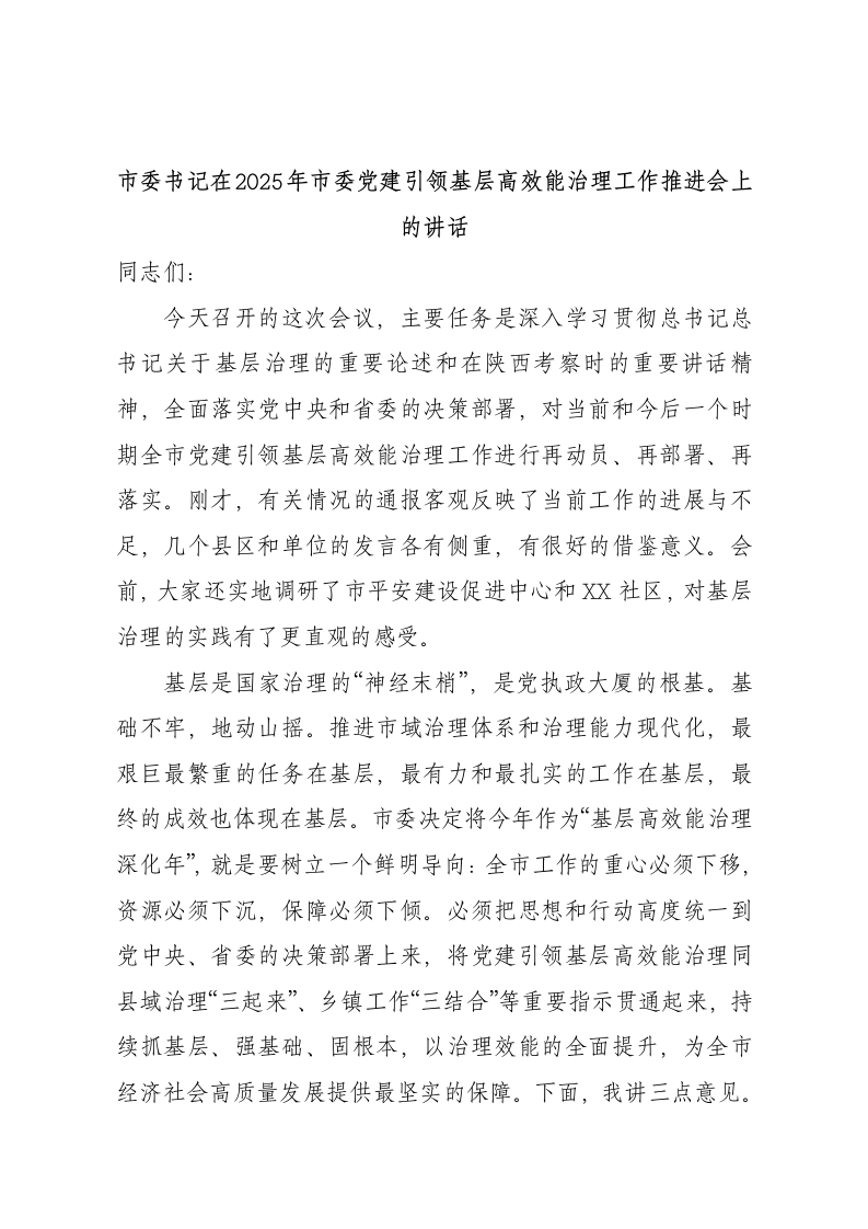 市委书记在2025年市委党建引领基层高效能治理工作推进会上的讲话同志们:今天召开的这次会议,主要任务是深入学习贯彻总书记总书记关于基层治理的重要论述和在陕西考察时的重要讲话精神,全面落实党中央和省委的决策部署,对当前和今后一个时期全市党建引领基层高效能治理工作进行再动员、再部署、再落实。刚才,有关情况的通报客观反映了当前工作的进展与不足,几个县区和单位的发言各有侧重,有很好的借鉴意义。会前,大家还实地调研了市平安建设促进中心和X社区,对基层治理的实践有了更直观的感受。基层是国家治理的“神经末梢”,是党执政大厦的根基。基础不牢,地动山摇。推进市域治理体系和治理能力现代化,最艰巨最繁重的任务在基层,最有力和最扎实的工作在基层,最终的成效也体现在基层。市委决定将今年作为“基层高效能治理深化年”,就是要树立一个鲜明导向:全市工作的重心必须下移,资源必须下沉,保障必须下倾。必须把思想和行动高度统一到党中央、省委的决策部署上来,将党建引领基层高效能治理同县域治理“三起来”、乡镇工作“三结合”等重要指示贯通起来,持续抓基层、强基础、固根本,以治理效能的全面提升,为全市经济社会高质量发展提供最坚实的保障。下面,我讲三点意见。一、正视成绩与挑战,深刻把握新时代基层治理的战略定位过去一个时期,全市各级党组织认真贯彻落实上级部署,将加强基层治理作为一项基础性、全局性工作来抓,取得了阶段性成效。治理体系不断健全,责任链条不断压实,基层党组织的政治功能和组织功能得到显著增强,解决了一批群众反映强烈的急难愁盼问题,维护了社会大局的和谐稳定。但同时,必须清醒地认识到,对标新时代新征程的更高要求,对照人民群众对美好生活的新期待,我市基层治理工作仍存在一些不容忽视的短板和弱项。例如,部分地区的党建引领作用虚化弱化,党组织的领导核心地位不够突出;治理手段相对传统,运用法治思维、科技手段破解难题的能力有待提升;资源整合力度不足,“九龙治水”但合力不强的现象依然存在;部分基层干部能力作风与新形势新任务不相适应,存在本领恐慌。这些问题,既是挑战,也是下一步工作的发力点。当前,我市正处在转型发展的关键期、深化改革的攻坚期、社会矛盾的突出期,各类风险隐患交织叠加。越是在这样的时期,越要凸显基层治理的“压舱石”作用。只有把基层这块阵地守好建强,把千家万户的工作做实做细,才能有效防范化解风险,筑牢安全发展的底线。全市上下必须从战略和全局的高度,充分认识党建引领基层高效能治理的极端重要性和现实紧迫性,以“时时